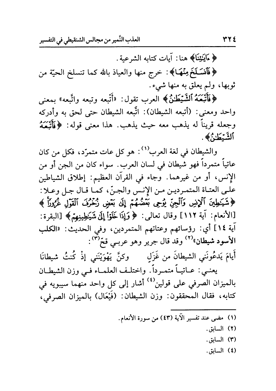 يعني: عاتيًا مُتَمَرِّدًا. واختلف العلماء في وزن الشَّيْطَان بالميزان الصرفي على قولين (¬٤) أشار إلى كل واحد منهما سيبويه في كتابه، فقال المحققون: وزن الشيطان: (فَيْعَال) بالميزان الصرفي،