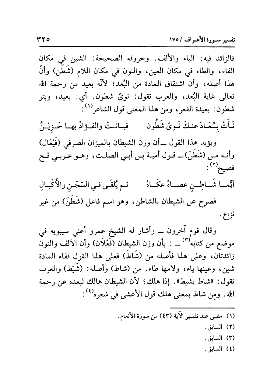فالزائد فيه: الياء والألف. وحروفه الصحيحة: الشين في مكان الفاء، والطاء في مكان العين، والنون في مكان اللام (شَطَن) وأنّ هذا أصله، وأن اشتقاق المادة من البُعد؛ لأنّه بعيد من رحمة الله تعالى غاية البُعد، والعرب تقول: نوىً شطون. أي: بعيد، وبئر شطون: بعيدة القعر، ومن هذا المعنى قول الشاعر (¬١):