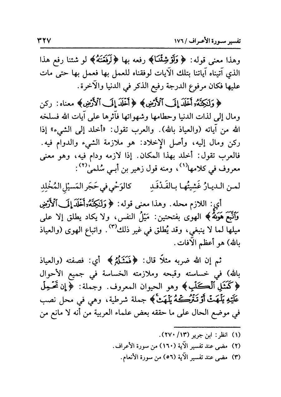 {وَلَكِنَّهُ أَخْلَدَ إِلَى الأَرْضِ} أَخْلَدَ إِلَى الأَرْضِ معناه: ركن ومال إلى لَذَّاتِ الدّنْيَا وحطامها وشهواتها فآثَرَها على آيات الله فسَلَخَهُ الله من آياته (والعياذ بالله). والعرب تقول: أخلد إلى الشيء: إذا رَكَنَ ومَالَ إلَيْهِ، وأصل الإخلاد: هو ملازمة الشيء والدوام فيه. فالعرب تقول: أخلد بهذا المكان: إذا لازَمَهُ ودَامَ فِيه، وهو معنى معروف في كلامها (¬١)، ومنه قول زهير بن أبي سُلمى (¬٢):