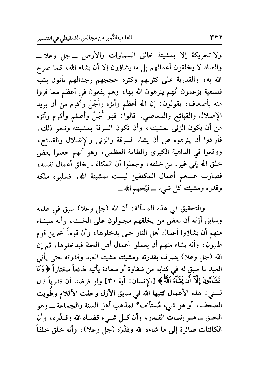 والتحقيق في هذه المسألة: أن الله (جل وعلا) سبق في علمه وسابق أزله أن بعض من يخلقهم مجبولون على الخبث، وأنه سيشاء منهم أن يشاءوا أعمال أهل النار حتى يدخلوها، وأن قومًا آخرين قوم طيبون، وأنه يشاء منهم أن يعملوا أعمال أهل الجنة فيدخلوها، ثم إن الله (جل وعلا) يصرف بقدرته ومشيئته مشيئة العبد وقدرته حتى يأتي العبد ما سبق له في كتابه من شقاوة أو سعادة يأتيه طائعًا مختارًا {وَمَا تَشَاءُونَ إِلَاّ أَن يَشَاءَ اللَّهُ} [الإنسان: آية ٣٠] فلو فرضنا أن قدريًّا قال لسنّي: هذه الأعمال كتبها الله في سابق الأزل وجفت الأقلام وطُويت الصحف، أو هو شيء مُستأنف؟ فمذهب أهل السنة والجماعة -وهو الحق- هو إثبات القدر، وأن كل شيء قضاه الله وقدَّره، وأن الكائنات صائرة إلى ما شاءه الله وقدَّرَه (جل وعلا)، وأنه خلق خلقًا