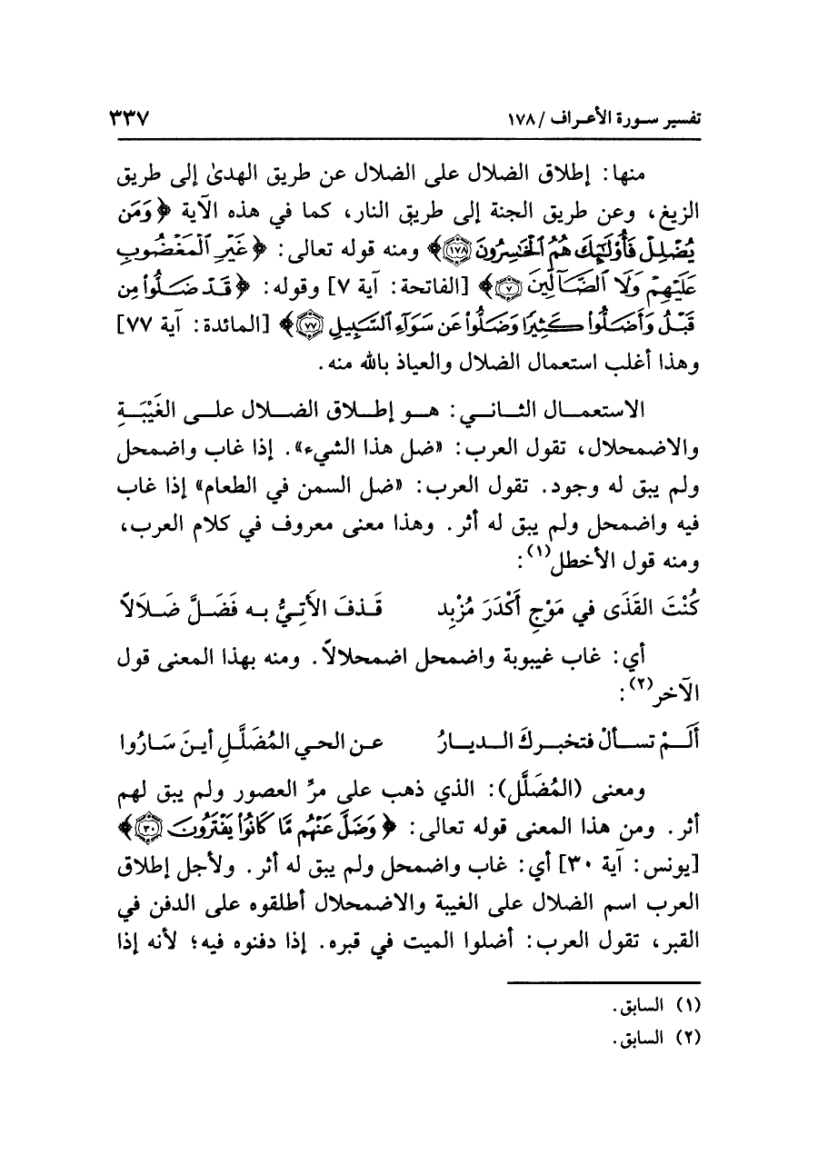 الاستعمال الثاني: هو إطلاق الضلال على الغَيْبَةِ والاضمحلال، تقول العرب: «ضل هذا الشيء». إذا غاب واضْمَحَلَّ ولم يبق له وجود. تقول العرب: «ضَلَّ السمن في الطَّعَام» إذا غاب فيه واضْمَحل ولم يبق له أثر. وهذا معنى معروف في كلام العرب، ومنه قول الأخطل (¬١):