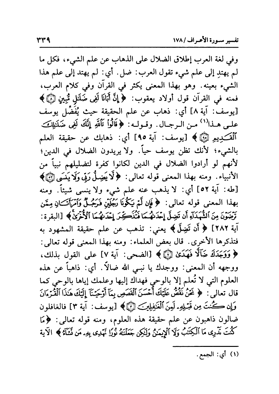 وفي لغة العرب إطلاق الضلال على الذهاب عن علم الشيء، فكل ما لم يهتدِ إلى علم شيء تقول العرب: ضل. أي: لم يهتد إلى علم هذا الشيء بعينه. وهو بهذا المعنى يكثر في القرآن وفي كلام العرب، فمنه في القرآن قول أولاد يعقوب: {إِنَّ أَبَانَا لَفِي ضَلَالٍ مُّبِينٍ} [يوسف: آية ٨] أي: ذهاب عن علم الحقيقة حيث يُفَضِّل يوسف على هذا (¬١) من الرجال. وقوله: {قَالُواْ تَاللَّهِ إِنَّكَ لَفِي ضَلَالِكَ الْقَدِيمِ (٩٥)} [يوسف: آية ٩٥] أي: ذهابك عن حقيقة العلم بالشيء؛ لأنك تظن يوسف حيًّا، ولا يريدون الضلال في الدين؛ لأنهم لو أرادوا الضلال في الدين لكانوا كفرة لتضليلهم نبيًّا من الأنبياء. ومنه بهذا المعنى قوله تعالى: {لَا يَضِلُّ رَبِّي وَلَا يَنسَى} [طه: آية ٥٢] أي: لا يذهب عنه علم شيء ولا ينسى شيئًا. ومنه بهذا المعنى قوله تعالى: {فَإِن لَّمْ يَكُونَا رَجُلَيْنِ فَرَجُلٌ وَامْرَأَتَانِ مِمَّن تَرْضَوْنَ مِنَ الشُّهَدَاء أَن تَضِلَّ إْحْدَاهُمَا فَتُذَكِّرَ إِحْدَاهُمَا الأُخْرَى} [البقرة: آية ٢٨٢] {أَن تَضِلَّ} يعني: تذهب عن علم حقيقة المشهود به فتذكرها الأخرى. قال بعض العلماء: وأنه بهذا المعنى قوله تعالى: {وَوَجَدَكَ ضَالاً فَهَدَى (٧)} [الضحى: آية ٧] على القول بذلك، ووجهه أن المعنى: ووجدك يا نبي الله ضالاً؛ أي: ذاهبًا عن هذه العلوم التي لا تُعلم إلا بالوحي فهداك إليها وعلمك إياها بالوحي كما قال تعالى: {نَحْنُ نَقُصُّ عَلَيْكَ أَحْسَنَ الْقَصَصِ بِمَا أَوْحَيْنَا إِلَيْكَ هَذَا الْقُرْآنَ وَإِن كُنتَ مِن قَبْلِهِ لَمِنَ الْغَافِلِينَ (٣)} [يوسف: آية ٣] فالغافلون ضالون ذاهبون عن علم حقيقة هذه العلوم، ومنه قوله تعالى: {مَا كُنتَ تَدْرِي مَا الْكِتَابُ وَلَا الإِيمَانُ وَلَكِن جَعَلْنَاهُ نُورًا نَّهْدِي بِهِ مَنْ نَّشَاء} الآية