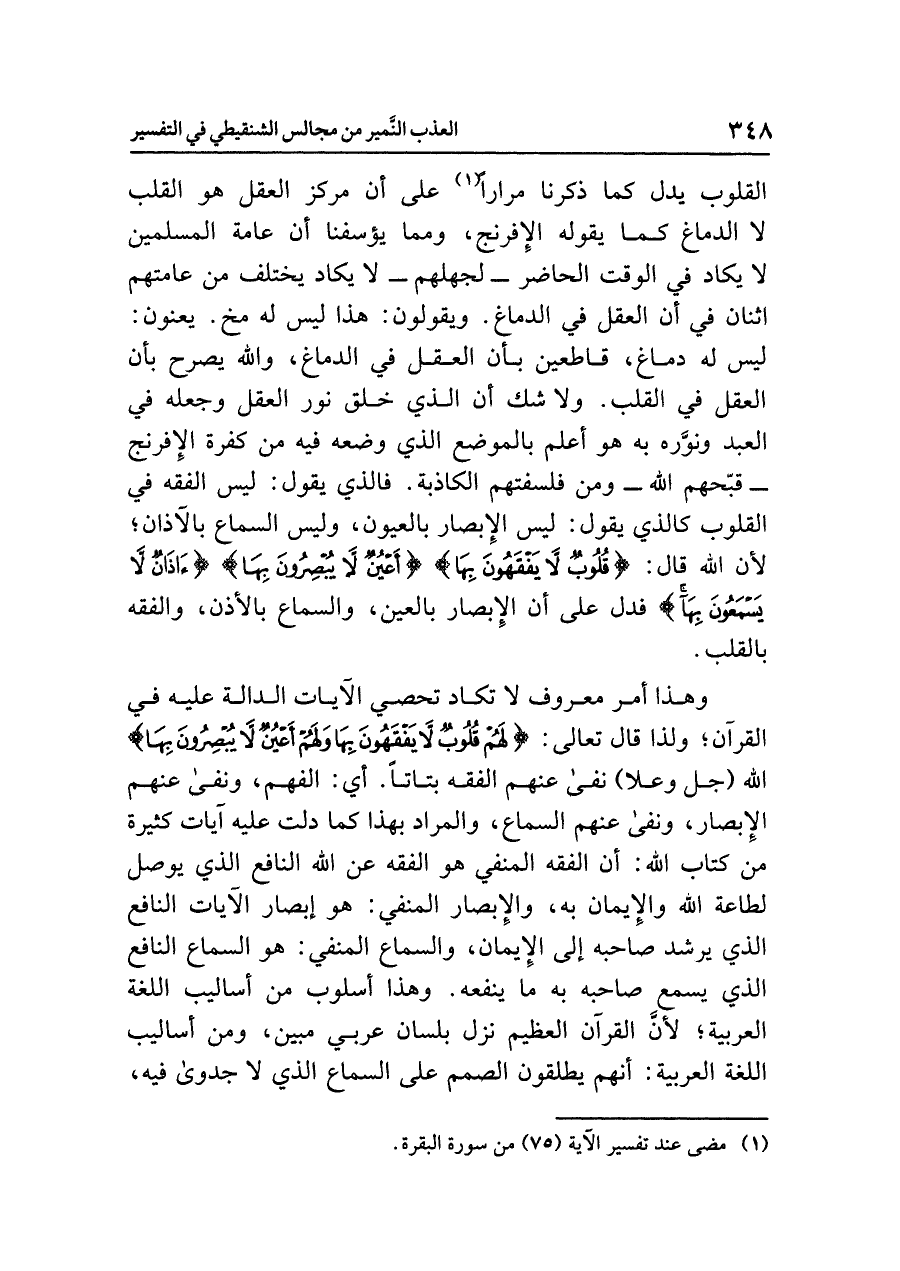 القلوب يدل كما ذكرنا مرارًا (¬١) على أن مركز العقل هو القلب لا الدماغ كما يقوله الإفرنج، ومما يؤسفنا أن عامة المسلمين لا يكاد في الوقت الحاضر- لجهلهم - لا يكاد يختلف من عامتهم اثنان في أن العقل في الدماغ. ويقولون: هذا ليس له مخ. يعنون: ليس له دماغ، قاطعين بأن العقل في الدماغ، والله يصرح بأن العقل في القلب. ولا شك أن الذي خلق نور العقل وجعله في العبد ونوَّره به هو أعلم بالموضع الذي وضعه فيه مِنْ كَفَرَةِ الإفْرِنْج -قبَّحهم الله- ومن فلسفتهم الكاذبة. فالذي يقول: ليس الفقه في القلوب كالذي يقول: ليس الإبصار بالعيون، وليس السماع بالآذان؛ لأن الله قال: {قُلُوبٌ لَاّ يَفْقَهُونَ بِهَا} {أَعْيُنٌ لَاّ يُبْصِرُونَ بِهَا} {آذَانٌ لَاّ يَسْمَعُونَ بِهَا} فدل على أن الإبصار بالعين، والسماع بالأذن، والفقه بالقلب.