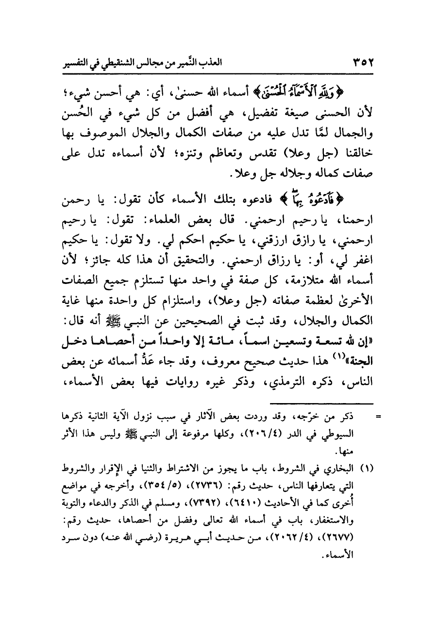 (¬١) البخاري في الشروط، باب: ما يجوز من الاشتراط والثنيا في الإقرار والشروط التي يتعارفها الناس. حديث رقم (٢٧٣٦)، (٥/ ٣٥٤)، وأخرجه في مواضع أخرى كما في الأحاديث (٦٤١٠)، (٧٣٩٢)، ومسلم في الذكر والدعاء والتوبة والاستغفار، باب: في أسماء الله تعالى وفضل من أحصاها. حديث رقم (٢٦٧٧)، (٤/ ٢٠٦٢)، من حديث أبي هريرة (رضي الله عنه) دون سرد الأسماء.