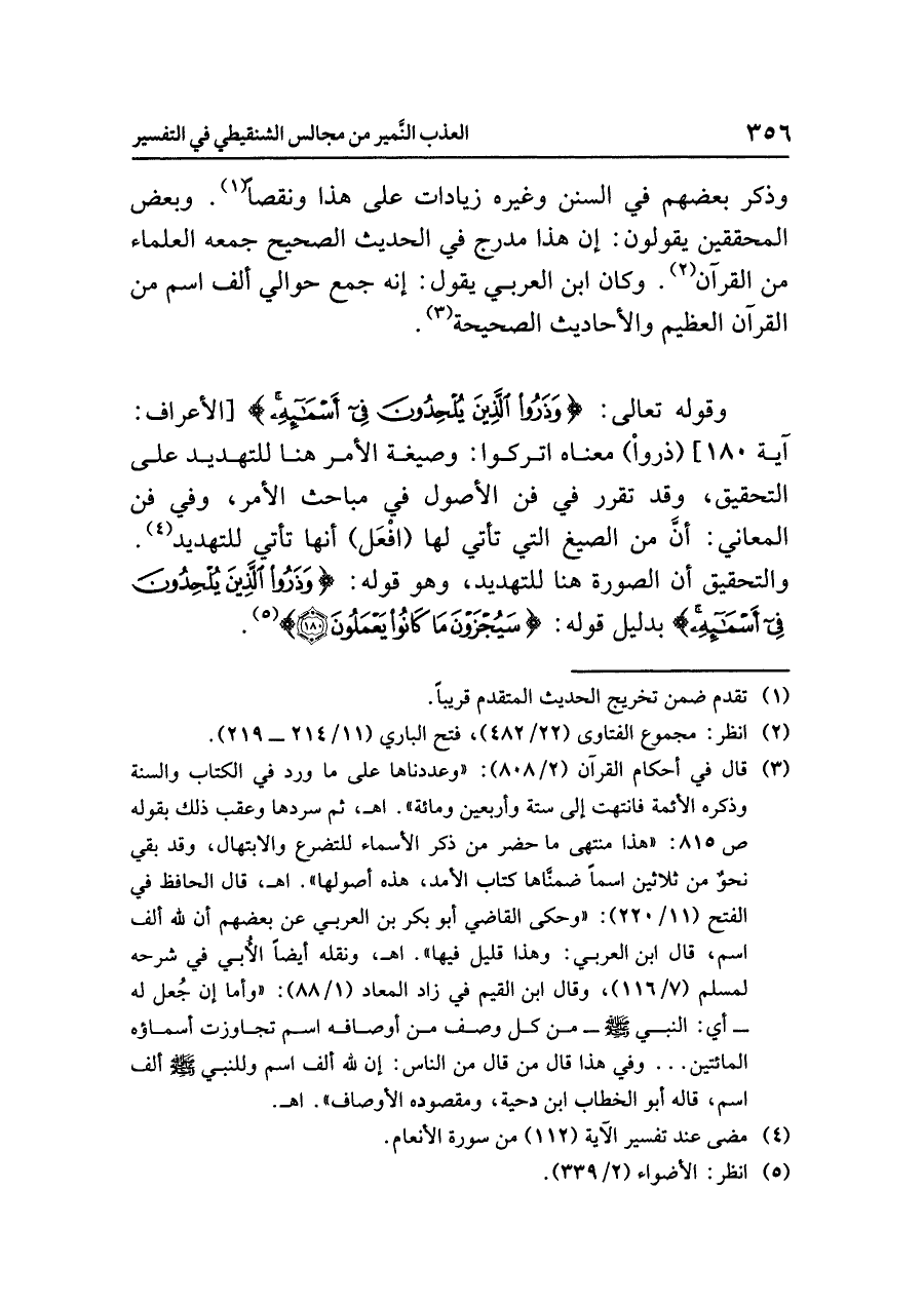وذكر بعضهم في السنن وغيره زيادات على هذا ونقصًا (¬١). وبعض المحققين يقولون: إن هدا مدرج في الحديث الصحيح جمعه العلماء من القرآن (¬٢). وكان ابن العربي يقول: إنه جمع حوالي ألف اسم من القرآن العظيم والأحاديث الصحيحة (¬٣).