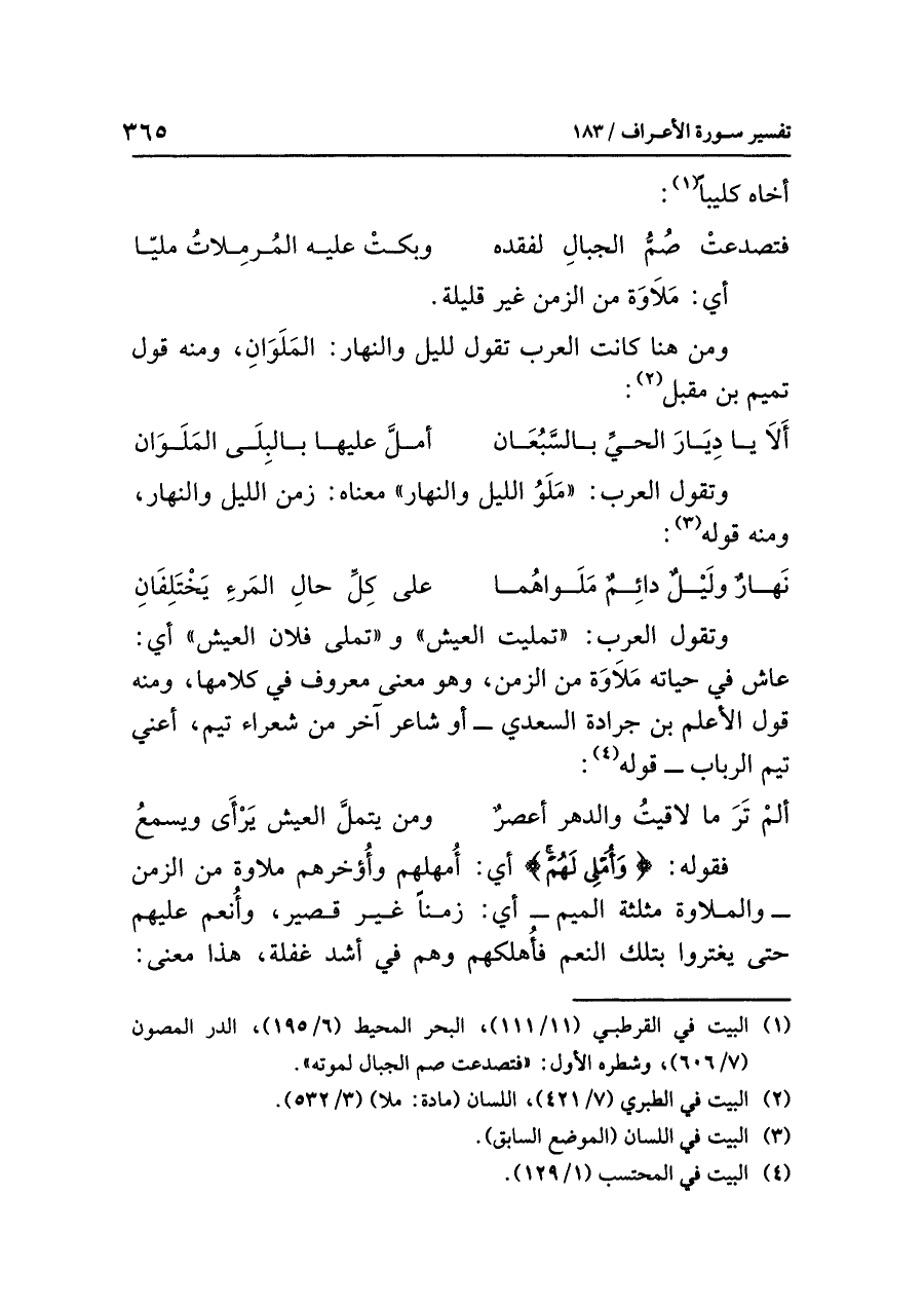 وتقول العرب: «تمليت العيش» و «تملى فلان العيش» أي: عاش في حياته مَلَاوَة من الزمن، وهو معنى معروف في كلامها، ومنه قول الأعلم بن جرادة السعدي -أو شاعر آخر من شعراء تيم، أعني تيم الرباب- قوله (¬٤):