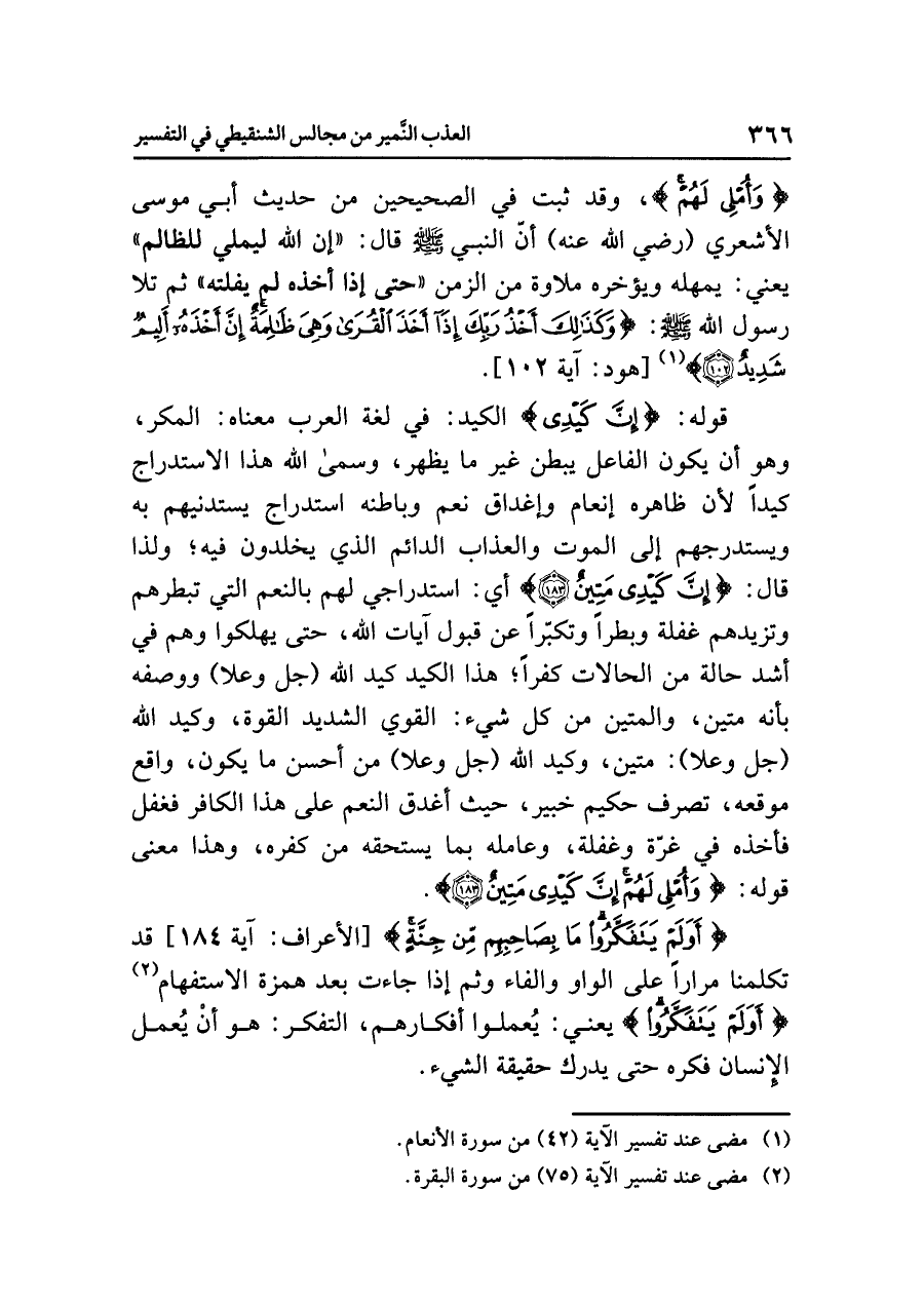 {وَأُمْلِي لَهُمْ}، وقد ثبت في الصحيحين من حديث أبي موسى الأشعري (رضي الله عنه) أنّ النبي صلى الله عليه وسلم قال: «إن الله ليملي للظالم» يعني: يمهله ويؤخره ملاوة من الزمن «حتى إذا أخذه لم يفلته» ثم تلا رسول الله صلى الله عليه وسلم: {وَكَذَلِكَ أَخْذُ رَبِّكَ إِذَا أَخَذَ الْقُرَى وَهِيَ ظَالِمَةٌ إِنَّ أَخْذَهُ أَلِيمٌ شَدِيدٌ (١٠٢)} (¬١) [هود: آية ١٠٢].