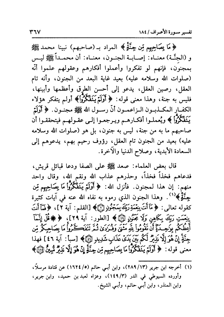 قال بعض العلماء: صعد صلى الله عليه وسلم على الصفا ودعا قبائل قريش، فدعاهم فخذًا فخذًا، وحذرهم عذاب الله ونقم الله، وقال واحد منهم: إن هذا لمجنون. فأنزل الله: {أَوَلَمْ يَتَفَكَّرُواْ مَا بِصَاحِبِهِم مِّن جِنَّةٍ} (¬١). وهذا الجنون الذي رَمَوْهُ بِهِ نفاه الله عنه في آيات كثيرة كقوله تعالى: {مَا أَنتَ بِنِعْمَةِ رَبِّكَ بِمَجْنُونٍ (٢)} [القلم: آية ٢] {فَمَا أَنتَ بِنِعْمَتِ رَبِّكَ بِكَاهِنٍ وَلَا مَجْنُونٍ} [الطور: آية ٢٩] {قُلْ إِنَّمَا أَعِظُكُم بِوَاحِدَةٍ أَن تَقُومُوا لله مَثْنَى وَفُرَادَى ثُمَّ تَتَفَكَّرُوا مَا بِصَاحِبِكُم مِّن جِنَّةٍ إِنْ هُوَ إِلَاّ نَذِيرٌ لَّكُم بَيْنَ يَدَيْ عَذَابٍ شَدِيدٍ (٤٦)} [سبأ: آية ٤٦] فهذا معنى قوله: {أَوَلَمْ يَتَفَكَّرُواْ مَا بِصَاحِبِهِم مِّن جِنَّةٍ إِنْ هُوَ إِلَاّ نَذِيرٌ مُّبِينٌ (١٨٤)}