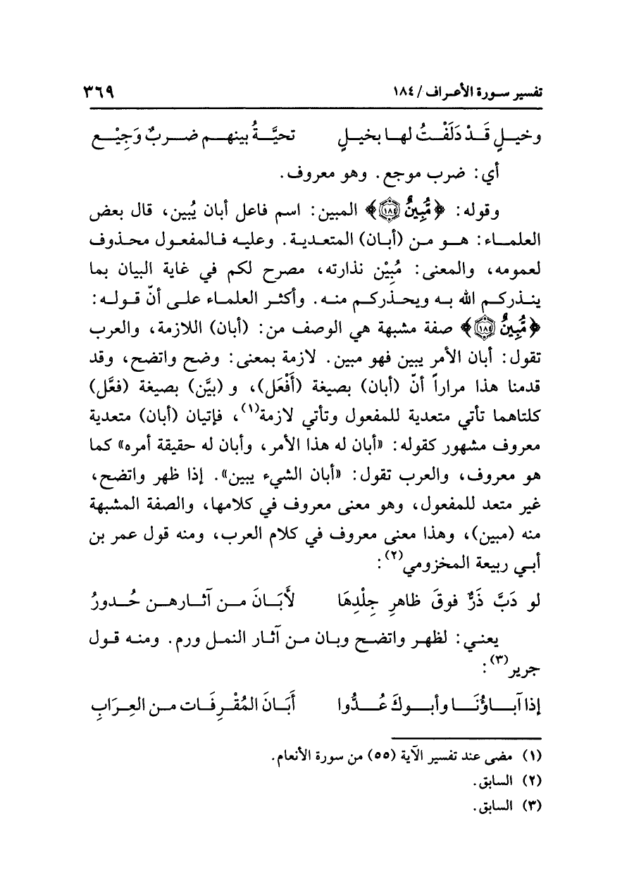 وقوله: {مُّبِينٌ} المبين: اسم فاعل أبان يُبين، قال بعض العلماء: هو من (أبان) المتعدية. وعليه فالمفعول محذوف لعمومه، والمعنى: مُبِين نذارته، مصرح لكم في غاية البيان بما ينذركم الله به ويحذركم منه. وأكثر العلماء على أنّ قوله: {مُّبِينٌ} صفة مشبهة هي الوصف من: (أبان) اللازمة، والعرب تقول: أبان الأمر يبين فهو مبين، لازمة بمعنى: وضح واتضح، وقد قدمنا هذا مرارًا أنّ (أبان) بصيغة (أَفْعَل)، و (بيَّن) بصيغة (فعَّل) كلتاهما تأتي متعدية للمفعول وتأتي لازمة (¬١)، فإتيان (أبان) متعدية معروف مشهور كقوله: أبان له هذا الأمر، وأبان له حقيقة أمره، كما هو معروف، والعرب تقول: أبان الشيء يبين: إذا ظهر واتضح، غير متعد للمفعول، وهو معنى معروف في كلامها، والصفة المشبهة منه (مبين)، وهذا معنى معروف في كلام العرب، ومنه قول عمر بن أبي ربيعة المخزومي (¬٢):