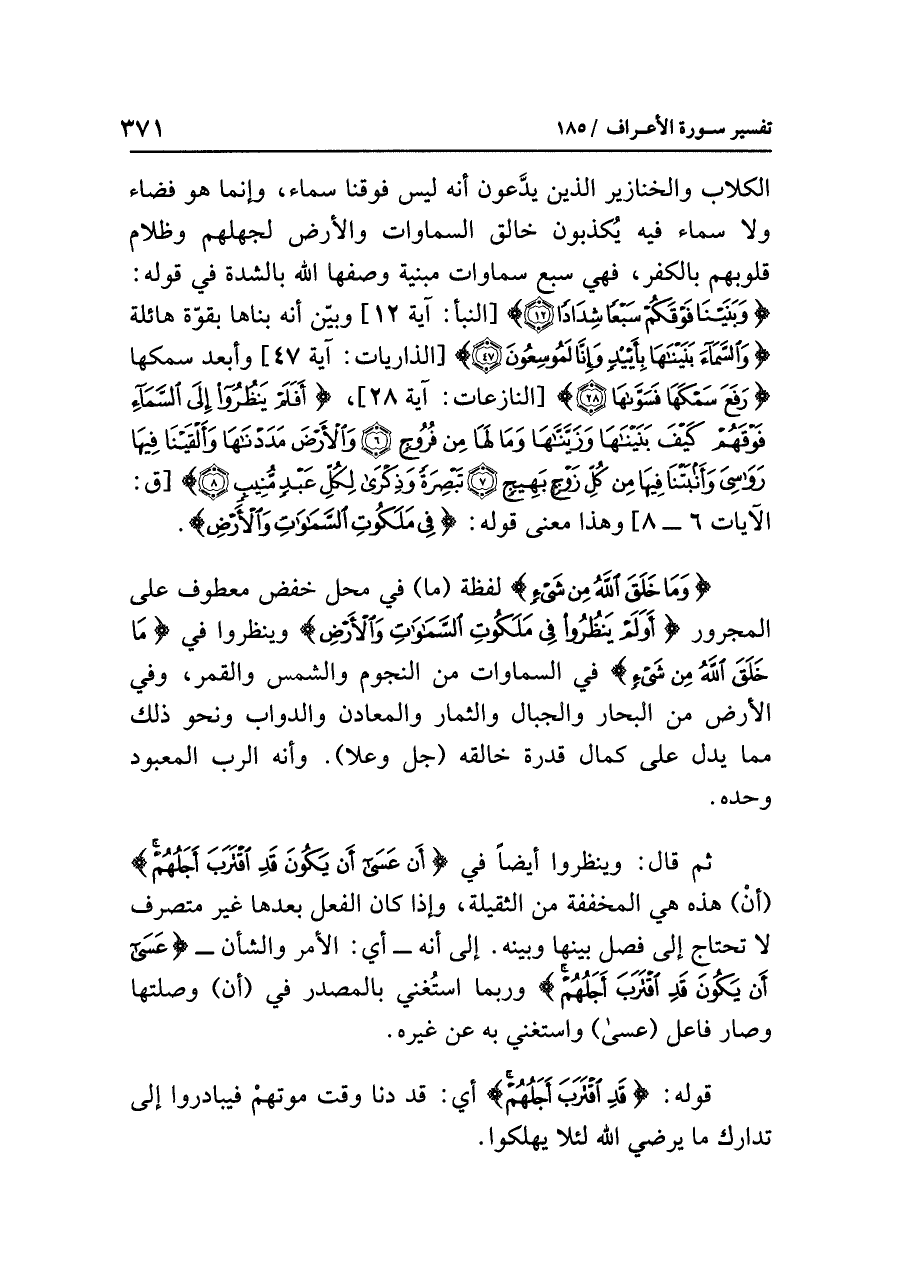 ثم قال: وينظروا أيضًا في {وَأَنْ عَسَى أَن يَكُونَ قَدِ اقْتَرَبَ أَجَلُهُمْ} (أنْ) هذه هي المخففة من الثقيلة، وإذا كان الفعل بعدها غير متصرف لا تحتاج إلى فصل بينها وبينه. إلى أنه -أي: الأمر والشأن- {عَسَى أَن يَكُونَ قَدِ اقْتَرَبَ أَجَلُهُمْ} وربما استُغني بالمصدر في (أن) وصلتها وصار فاعل (عسى) واستغني به عن غيره.