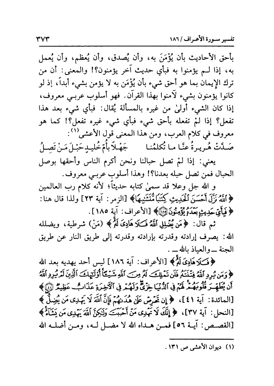 بأحق الأحاديث بأن يُؤْمَنَ به، وأن يُصدق، وأن يُعظم، وأن يُعمل به، إذا لم يؤمنوا به فبأي حديث آخر يؤمنون؟! والمعنى: أنَّ مَنْ تَرَكَ الإيمان بما هو أحق شيء بأن يُؤْمَن به لا يؤمن بشيء أبدًا؛ إذ لو كانوا يؤمنون بشيء لآمنوا بهذا القرآن. فهو أسلوب عربي معروف، إذا كان الشيء أولى من غيره بالمسألة يُقال: فبأي شيء بعد هذا تفعل؟ إذا لمْ تفعله بأحق شيء فبأي شيء غيره تفعل؟! كما هو معروف في كلام العرب، ومن هذا المعنى قول الأعشى (¬١):