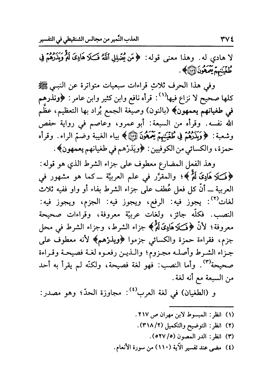 وهذ الفعل المضارع معطوف على جزاء الشرط الذي هو قوله: {فَلَا هَادِيَ لَهُ} والمقرَّر في علم العربيَّة -كما هو مشهور في العربية- أنّ كل فعل عُطف على جزاء الشرط بفاء أو واو ففيه ثلاث لغات (¬٢): يجوز فيه: الرفع، ويجوز فيه: الجزم، ويجوز فيه: النصب. فكلّه جائز، ولغات عربيّة معروفة، وقراءات صحيحة معروفة؛ لأنّ {فَلَا هَادِيَ لَهُ} جزاء الشرط، وجزاء الشرط في محل جزم، فقراءة حمزة والكسائي جزموا {ويذرْهم} لأنه معطوف على جزاء الشرط وأصله مجزوم؛ والذين رفعوه لغة فصيحة وقراءة صحيحة (¬٣). وأما النصب: فهو لغة فصيحة، ولكنّه لم يقرأ به أحد من السبعة مع أنه لغة.