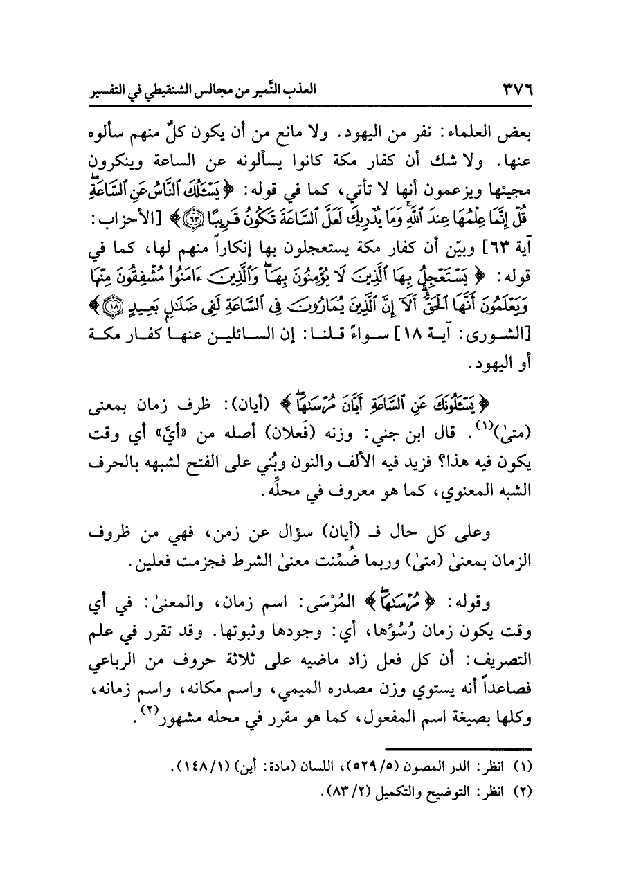 {يَسْأَلُونَكَ عَنِ السَّاعَةِ أَيَّانَ مُرْسَاهَا} (أيان): ظرف زمان بمعنى (متى) (¬١). قال ابن جني: وزنه (فَعلان) أصله من «أيَّ» أي وقت يكون فيه هذا؟ فزيد فيه الألف والنون وبُني على الفتح لشبهه بالحرف الشبه المعنوي، كما هو معروف في محلِّه.
