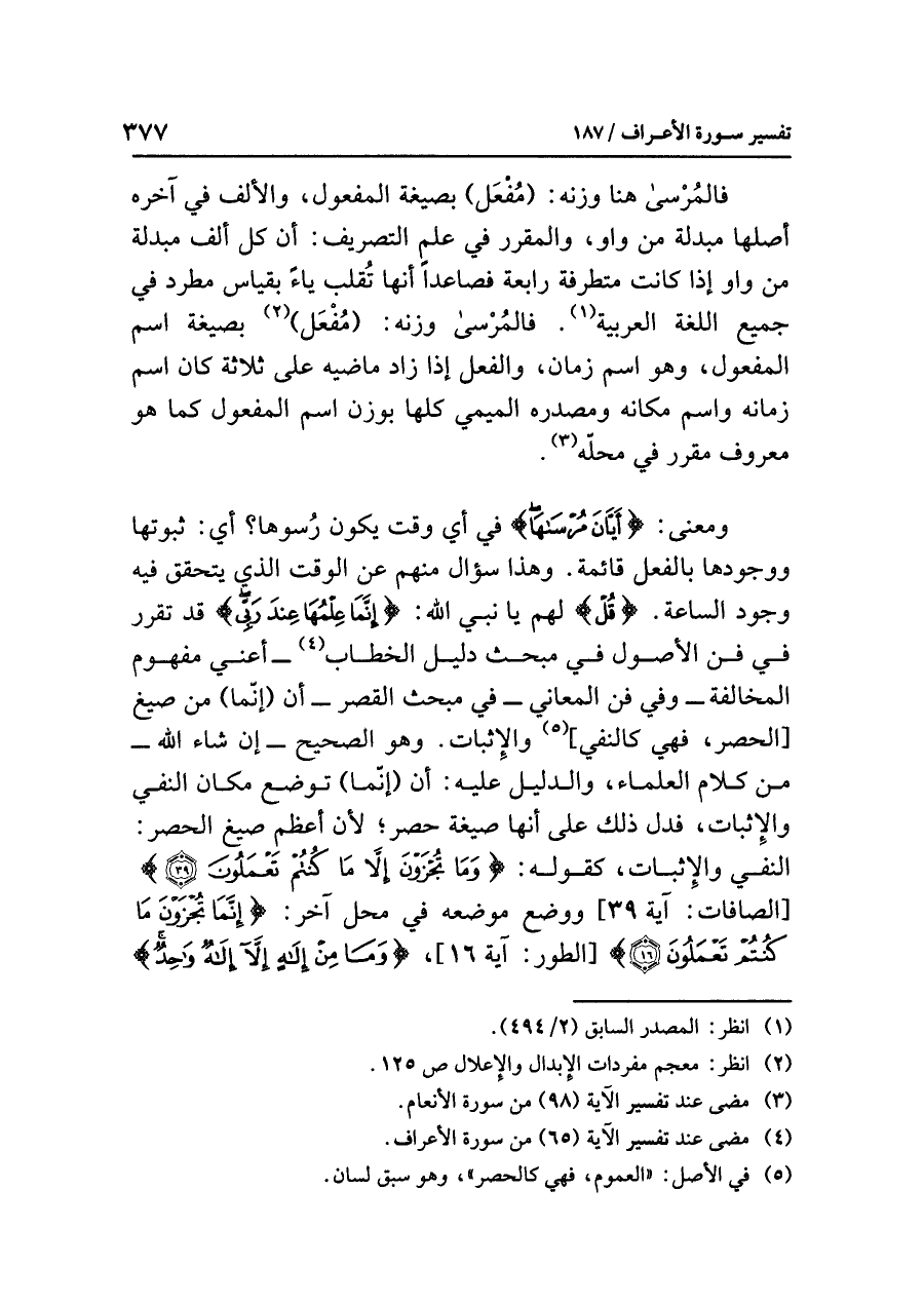 فالمُرْسى هنا وزنه: (مُفْعَل) بصيغة المفعول، والألف في آخره أصلها مبدلة من واو، والمقرَّر في علم التصريف: أن كل ألف مبدلة من واو إذا كانت متطرِّفة رابعة فصاعدًا أنها تُقلب ياءً بقياس مُطَّرِد في جميع اللغة العربية (¬١). فالمُرْسى وزنه: (مُفْعَل) (¬٢) بصيغة اسم المفعول، وهو اسم زمان، والفعل إذا زاد ماضيه على ثلاثة كان اسم زمانه واسم مكانه ومصدره الميمي كلها بوزن اسم المفعول كما هو معروف مُقَرَّرٌ في محلّه (¬٣).