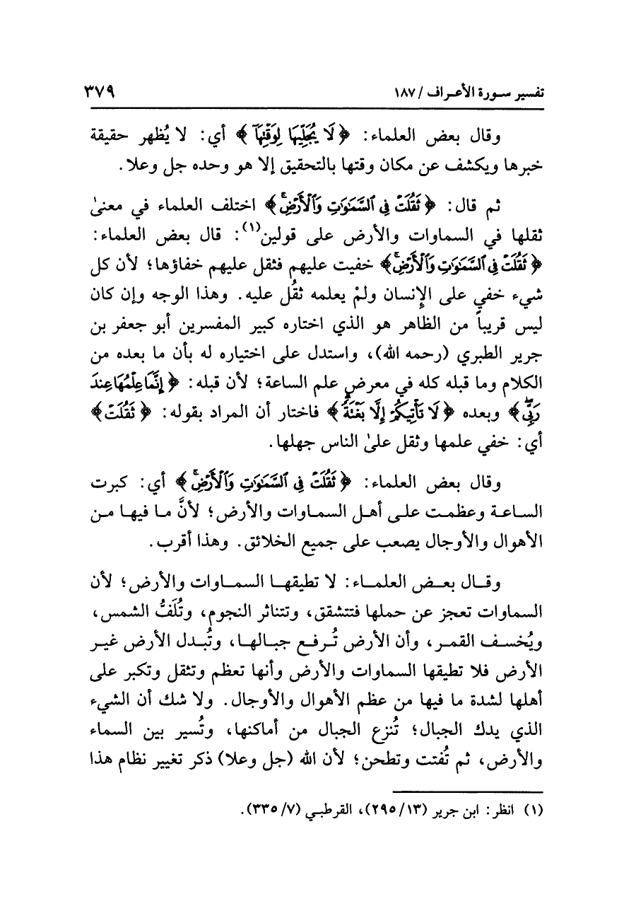 ثم قال: {ثَقُلَتْ فِي السَّمَاوَاتِ وَالأَرْضِ} اختلف العلماء في معنى ثقلها في السماوات والأرض على قولين (¬١): قال بعض العلماء: {ثَقُلَتْ فِي السَّمَاوَاتِ وَالأَرْضِ} خفيت عليهم فثقل عليهم خفاؤها؛ لأن كل شيء خفي على الإنسان ولمْ يعلمه ثقُل عليه. وهذا الوجه وإن كان ليس قريبًا من الظاهر هو الذي اختاره كبير المفسرين أبو جعفر بن جرير الطبري (رحمه الله)، واستدل على اخْتِيَارِهِ له بأن ما بَعْدَهُ مِنَ الْكَلامِ وما قبله كله في معرض علم الساعة؛ لأن قَبْلَهُ: {إِنَّمَا عِلْمُهَا عِندَ رَبِّي} وبعده: {لَا تَأْتِيكُمْ إِلَاّ بَغْتَةً} فاختار أن المراد بقوله: {ثَقُلَتْ} أي: خفي علمها وثقل على الناس جَهْلُهَا.