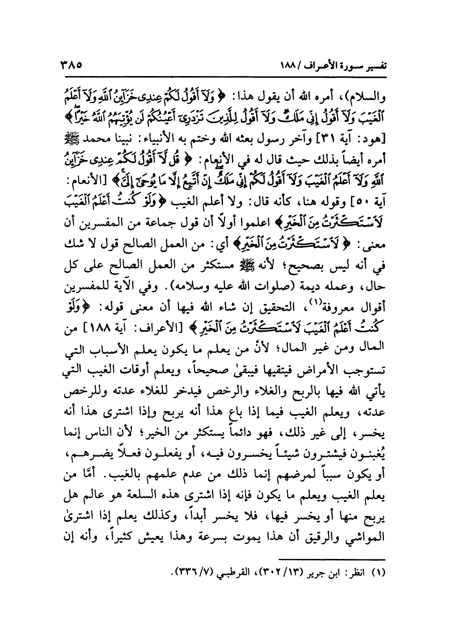وفي الآية للمفسرين أقوال معروفة (¬١)، التحقيق إن شاء الله فيها أن معنى قوله: {وَلَوْ كُنتُ أَعْلَمُ الْغَيْبَ لَاسْتَكْثَرْتُ مِنَ الْخَيْرِ} [الأعراف: آية ١٨٨]، من المال ومن غير المال؛ لأنَّ مَنْ يَعْلَمُ مَا يَكُونُ يعلم الأسباب التي تستوجب الأمراض فيتقيها فيبقى صحيحًا، ويعلم أوقات الغيب التي يأتي الله فيها بالربح والغلاء والرخص فيدخر للغلاء عدته وللرخص عدته، ويعلم الغيب فيما إذا باع هذا أنه يربح وإذا اشترى هذا أنه يخسر، إلى غير ذلك، فهو دائمًا يستكثر من الخير؛ لأن الناس إنما يُغبنون فيشترون شيئًا يخسرون فيه، أو يفعلون فعلاً يضرهم، أو يكون سببًا لمرضهم إنما ذلك من عدم علمهم بالغيب. أمَّا من يعلم الغيب ويعلم ما يكون فإنه إذا اشترى هذه السلعة هو عالم هل يربح منها أو يخسر فيها، فلا يخسر أبدًا، وكذلك يعلم إذا اشترى المواشي والرقيق أن هذا يموت بسرعة وهذا يعيش كثيرًا، وأنه إن