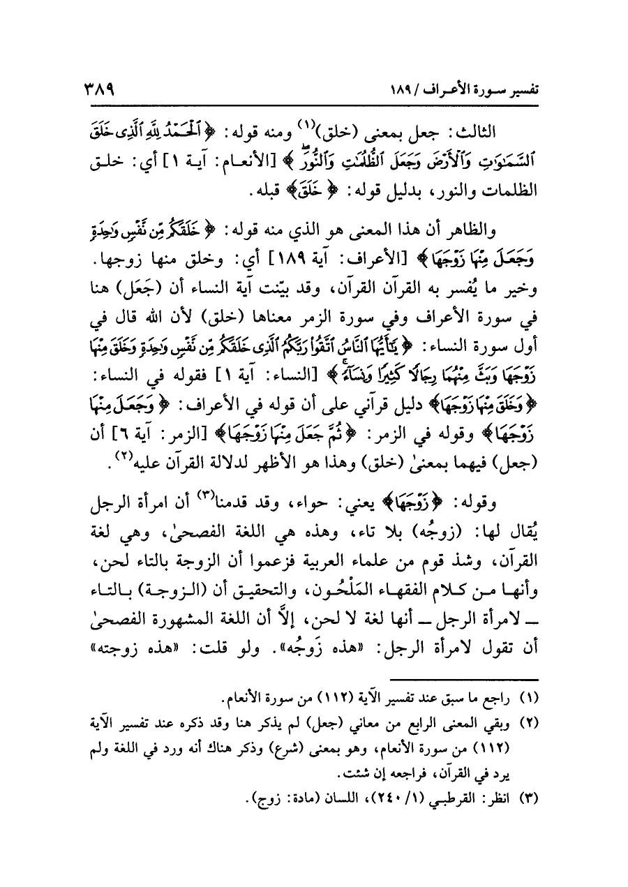 والظاهر أن هذا المعنى هو الذي منه قوله: {خَلَقَكُم مِّن نَّفْسٍ وَاحِدَةٍ وَجَعَلَ مِنْهَا زَوْجَهَا} [الأعراف: آية ١٨٩] أي: وخلق منها زوجها. وخير ما يُفسر به القرآن القرآن، وقد بينت آية النساء أن (جَعَل) هنا في سورة الأعراف وفي سورة الزمر معناها (خلق) لأن الله قال في أول سورة النساء: {يَا أَيُّهَا النَّاسُ اتَّقُواْ رَبَّكُمُ الَّذِي خَلَقَكُم مِّن نَّفْسٍ وَاحِدَةٍ وَخَلَقَ مِنْهَا زَوْجَهَا وَبَثَّ مِنْهُمَا رِجَالاً كَثِيرًا وَنِسَاء} [النساء: آية ١] فقوله في النساء: {وَخَلَقَ مِنْهَا زَوْجَهَا} دليل قرآنِي على أن قَوْلَهُ في الأعراف: {وَجَعَلَ مِنْهَا زَوْجَهَا} وقوله في الزمر: {ثُمَّ جَعَلَ مِنْهَا زَوْجَهَا} [الزمر: آية ٦] أن (جعل) فيهما بمعنى (خلق) وهذا هو الأظهر لدلالة القرآن عليه (¬٢).
