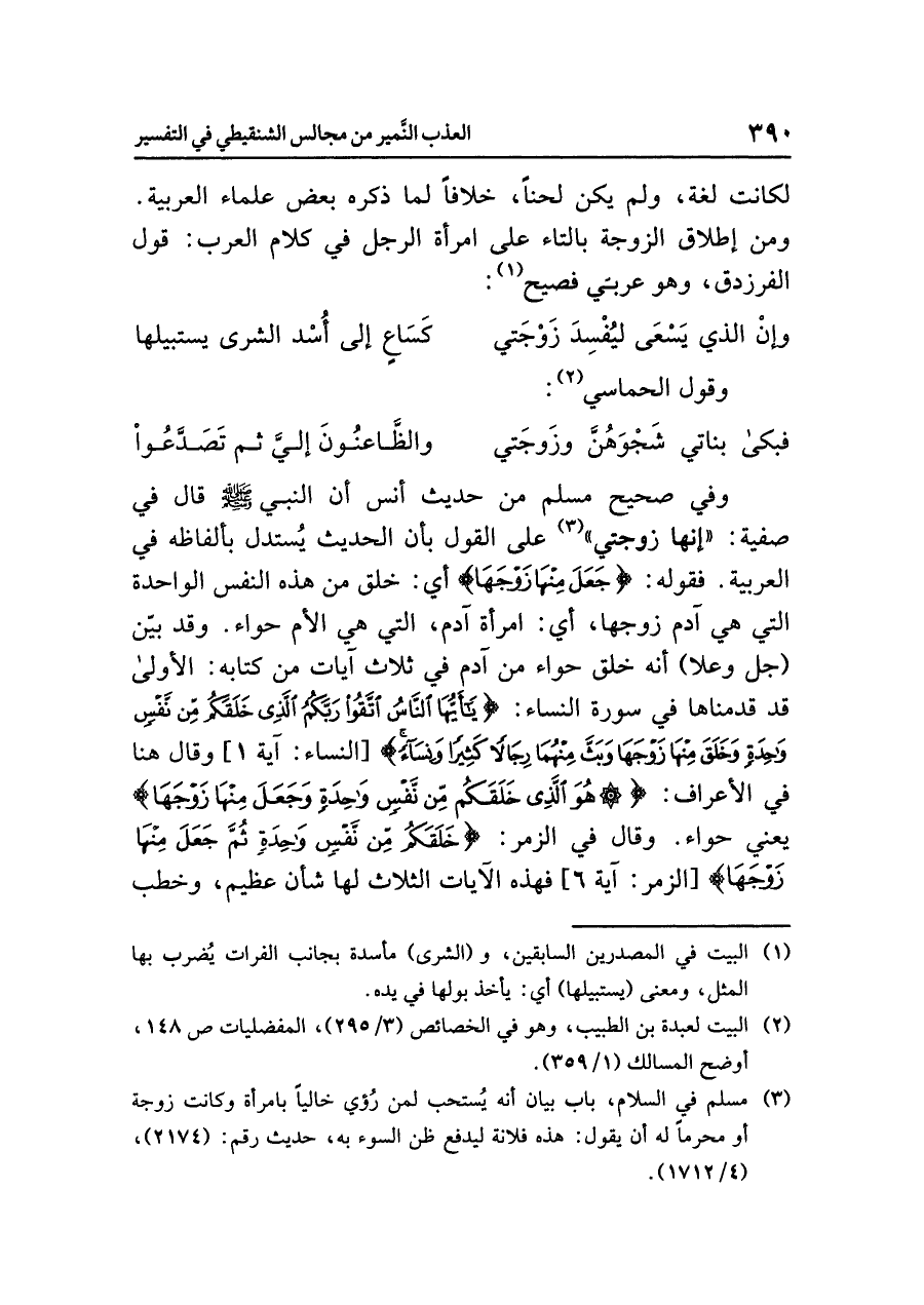 وفي صحيح مسلم من حديث أنس أن النبي صلى الله عليه وسلم قال في صَفِيَّة: «إنها زوجَتِي» (¬٣) على القول بأن الحديث يُستدل بألفاظه في العَرَبِيَّة. فقوله: {جَعَلَ مِنْهَا زَوْجَهَا} أي: خلق من هذه النفس الواحدة التي هي آدم زوجها، أي: امرأة آدم، التي هي الأم حواء. وقد بيّن (جل وعلا) أنه خلق حواء مِنْ آدَمَ في ثلاث آيات من كتابه: الأولى قد قَدَّمْنَاهَا في سورة النساء: {يَا أَيُّهَا النَّاسُ اتَّقُواْ رَبَّكُمُ الَّذِي خَلَقَكُم مِّن نَّفْسٍ وَاحِدَةٍ وَخَلَقَ مِنْهَا زَوْجَهَا وَبَثَّ مِنْهُمَا رِجَالاً كَثِيرًا وَنِسَاء} [النساء: آية ١] وقال هنا في الأعراف: {هُوَ الَّذِي خَلَقَكُم مِّن نَّفْسٍ وَاحِدَةٍ وَجَعَلَ مِنْهَا زَوْجَهَا} يعني حواء. وقال في الزمر: {خَلَقَكُم مِّن نَّفْسٍ وَاحِدَةٍ ثُمَّ جَعَلَ مِنْهَا زَوْجَهَا} [الزمر: آية ٦] فهذه الآيات الثلاث لها شأن عظيم، وخطب