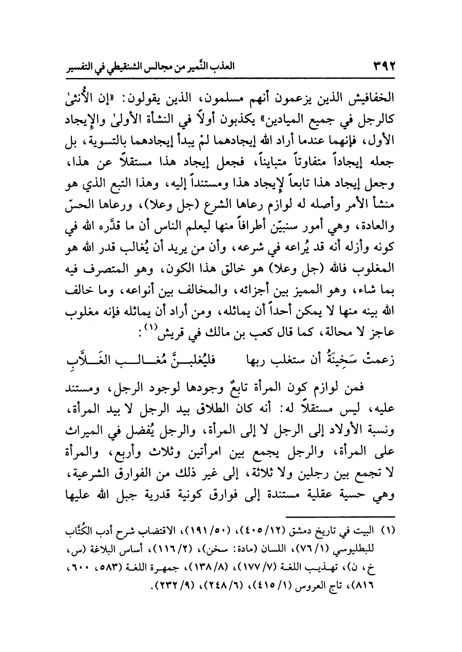 الخفافيش الذين يزعمون أنهم مسلمون، الذين يقولون: (إن الأُنثى كالرجل في جميع الميادين) يكذبون أولاً في النشأة الأولى والإيجاد الأول، فإنهما عندما أراد الله إيجادهما لمْ يبدأ إيجادهما بالتسوية، بل جعله إيجادًا متفاوتًا متباينًا، فجعل إيجاد هذا مستقلاًّ عن هذا، وجعل إيجاد هذا تابعًا لإيجاد هذا ومستندًا إليه، وهذا التبع الذي هو منشأ الأمر وأصله له لوازم رعاها الشرع (جل وعلا) ورعاها الحسّ والعادة، وهي أمور سنبيّن أطرافًا منها ليعلم الناس أن ما قدَّره الله في كونه وأزله أنه قد يُراعه في شرعه، وأَنَّ مَنْ يُريدُ أنْ يُغالب قدر الله هو المغْلُوب؛ فَالله (جل وعلا) هو خالق هذا الكون، وهو المتصرِّف فيه بما شاء، وهو المميز بين أجْزَائِهِ، والمخالف بين أنْوَاعِه، وما خالف الله بينه منها لا يمكن أحدًا أن يماثله، ومن أراد أن يماثله فإنه مغلوب عاجز لا محالة، كما قال كعب بن مالك في قريش (¬١):