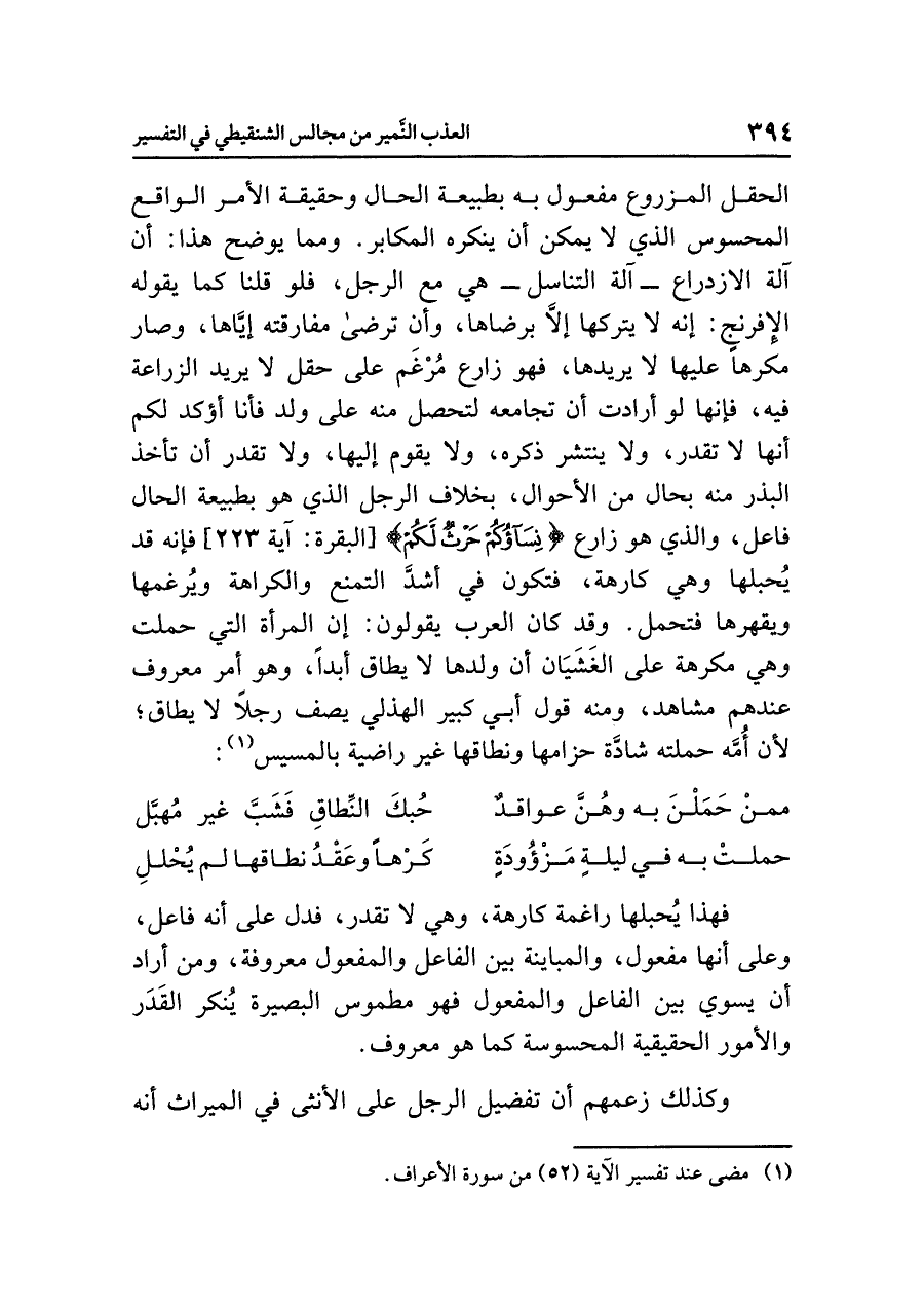 الحقل المزروع مفعول به بطبيعة الحال وحقيقة الأمر الواقع المحسوس الذي لا يمكن أن ينكره المكابر. ومما يوضح هذا: أن آلة الازدراع -آلة التناسل- هي مع الرجل، فلو قلنا كما يقوله الإفرنج: إنه لا يتركها إلَاّ برضاها، وأن ترضى مفارقته إيَّاها، وصار مكرهًا عليها لا يريدها، فهو زارع مُرْغَم على حقل لا يريد الزراعة فيه، فإنها لو أرادت أن تجامعه لتحصل منه على ولد فأنا أؤكد لكم أنها لا تقدر، ولا ينتشر ذكره، ولا يقوم إليها، ولا تقدر أن تأخذ البذر منه بحال من الأحوال، بخلاف الرجل الذي هو بطبيعة الحال فاعل، والذي هو زارع {نِسَآؤُكُمْ حَرْثٌ لَّكُمْ} [البقرة: آية ٢٢٣] فإنه قد يُحبلها وهي كارهة، فتكون في أشدّ التمنع والكراهة ويُرغمها ويقهرها فتحمل. وقد كان العرب يقولون: إن المرأة التي حملت وهي مكرهة على الغَشيان أن ولدها لا يطاق أبدًا، وهو أمر معروف عندهم مشاهد، ومنه قول أبي كبير الهذلي يصف رجلاً لا يطاق؛ لأن أُمَّه حملته شادَّة حزامها ونطاقها غير راضية بالمسيس (¬١):