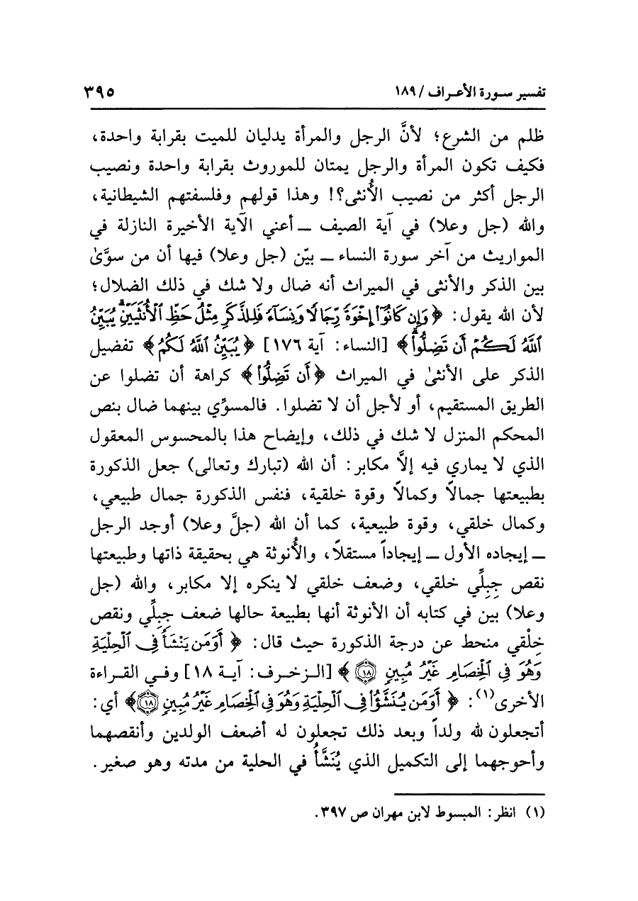 ظلم من الشرع؛ لأنَّ الرجل والمرأة يُدْلِيَان للميت بقرابة واحدة، فكيف تكون المرأة والرجل يمتان للموروث بقرابة واحدة ونصيب الرجل أكثر من نصيب الأُنثى؟! وهذا قولهم وفلسفتهم الشيطانية، والله (جل وعلا) في آية الصيف -أعني الآية الأخيرة النازلة في المواريث من آخر سورة النساء- بيّن (جل وعلا) فيها أَنَّ مَنْ سَوَّى بين الذكر والأنثى في الميراث أنه ضال ولا شك في ذلك الضلال؛ لأن الله يقول: {وَإِن كَانُواْ إِخْوَةً رِّجَالاً وَنِسَاء فَلِلذَّكَرِ مِثْلُ حَظِّ الأُنثَيَيْنِ يُبَيِّنُ اللَّهُ لَكُمْ أَن تَضِلُّواْ} [النساء: آية ١٧٦] {يُبَيِّنُ اللَّهُ لَكُمْ} تفضيل الذكر على الأنثى في الميراث {أَن تَضِلُّواْ} كراهة أن تضلوا عن الطريق المستقيم، أو لأجل أن لا تضلوا. فالمسوِّي بينهما ضال بنص المحكم المنزل لا شك في ذلك، وإيضاح هذا بالمحسوس المعقول الذي لا يماري فيه إلَاّ مكابر: أن الله (تبارك وتعالى) جعل الذكورة بطبيعتها جمالاً وكمالاً وقوة خلقية، فنفس الذكورة جمال طبيعي، وكمال خلقي، وقوة طبيعية، كما أن الله (جلَّ وعلا) أوجد الرجل - إيجاده الأول- إيجادًا مستقلاً، والأنُوثة هي بحقيقة ذاتها وطبيعتها نقص جِبِلّي خلقي، وضعف خلقي لا ينكره إلا مكابر، والله (جل وعلا) بين في كتابه أن الأنوثة أنها بطبيعة حالها ضعف جِبِلّي ونقص خِلْقي منحط عن درجة الذكورة حيث قال: {أَوَمَن يَنْشَأُ فِي الْحِلْيَةِ وَهُوَ فِي الْخِصَامِ غَيْرُ مُبِينٍ (١٨)} [الزخرف: آية ١٨] وفي القراءة الأخرى (¬١): {أَوَمَن يُنَشَّؤُاْ فِي الْحِلْيَةِ وَهُوَ فِي الْخِصَامِ غَيْرُ مُبِينٍ} أي أتجعلون لله ولدًا وبعد ذلك تجعلون له أضعف الولدين وأنقصهما وأحوجهما إلى التكميل الذي يُنَشَّأُ في الحلية من مدته وهو صغير.