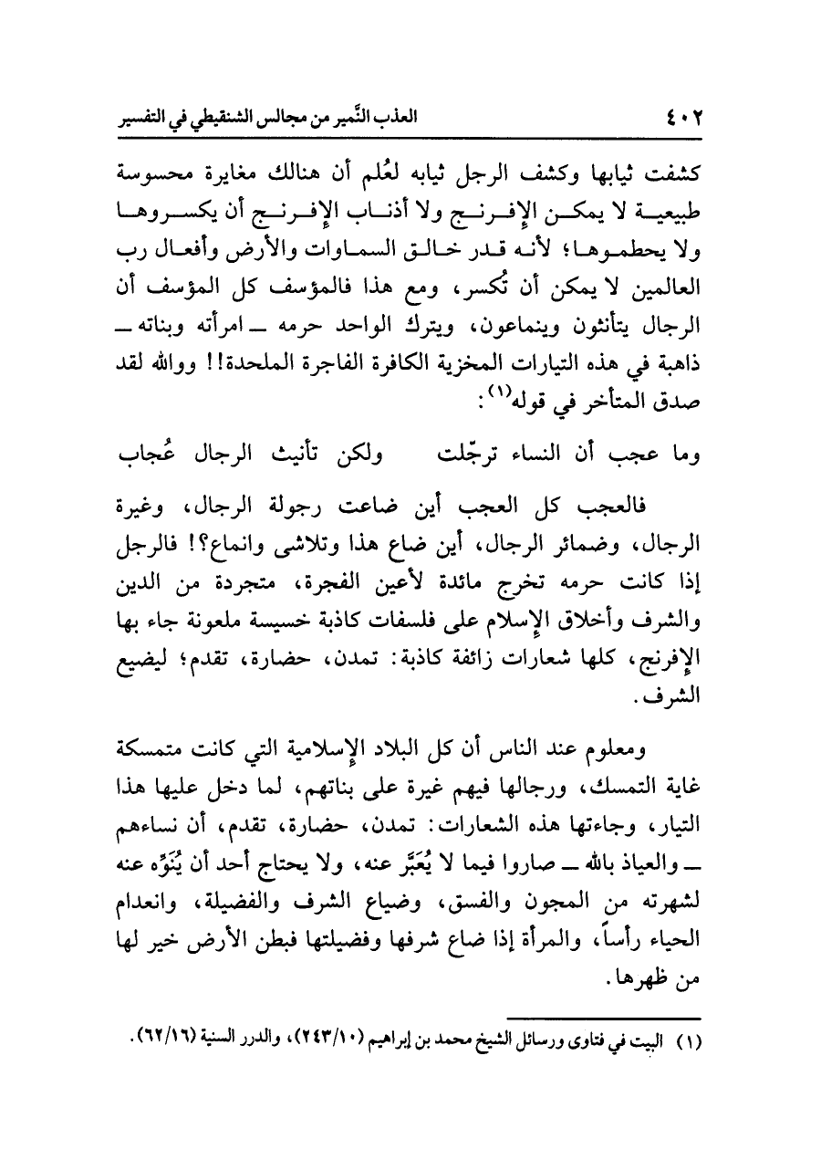 كشفت ثيابها وكشف الرجل ثيابه لعُلم أن هنالك مغايرة محسوسة طبيعية لا يمكن الإفرنج ولا أذناب الإفرنج أن يكسروها ولا يحطموها؛ لأنه قَدَرُ خَالِقِ السَّمَاوات والأرْضِ وأفعال رب العالمين لا يمكن أن تُكْسَر، ومع هذا فالمؤسف كل المؤسف أن الرجال يَتَأَنَّثُون وينماعون، ويترك الواحد حرمه -امرأته وبناته- ذاهبة في هذه التيارات المخزية الكافرة الفاجرة الملحدة!! ووالله لقد صدق المتأخر في قوله (¬١):