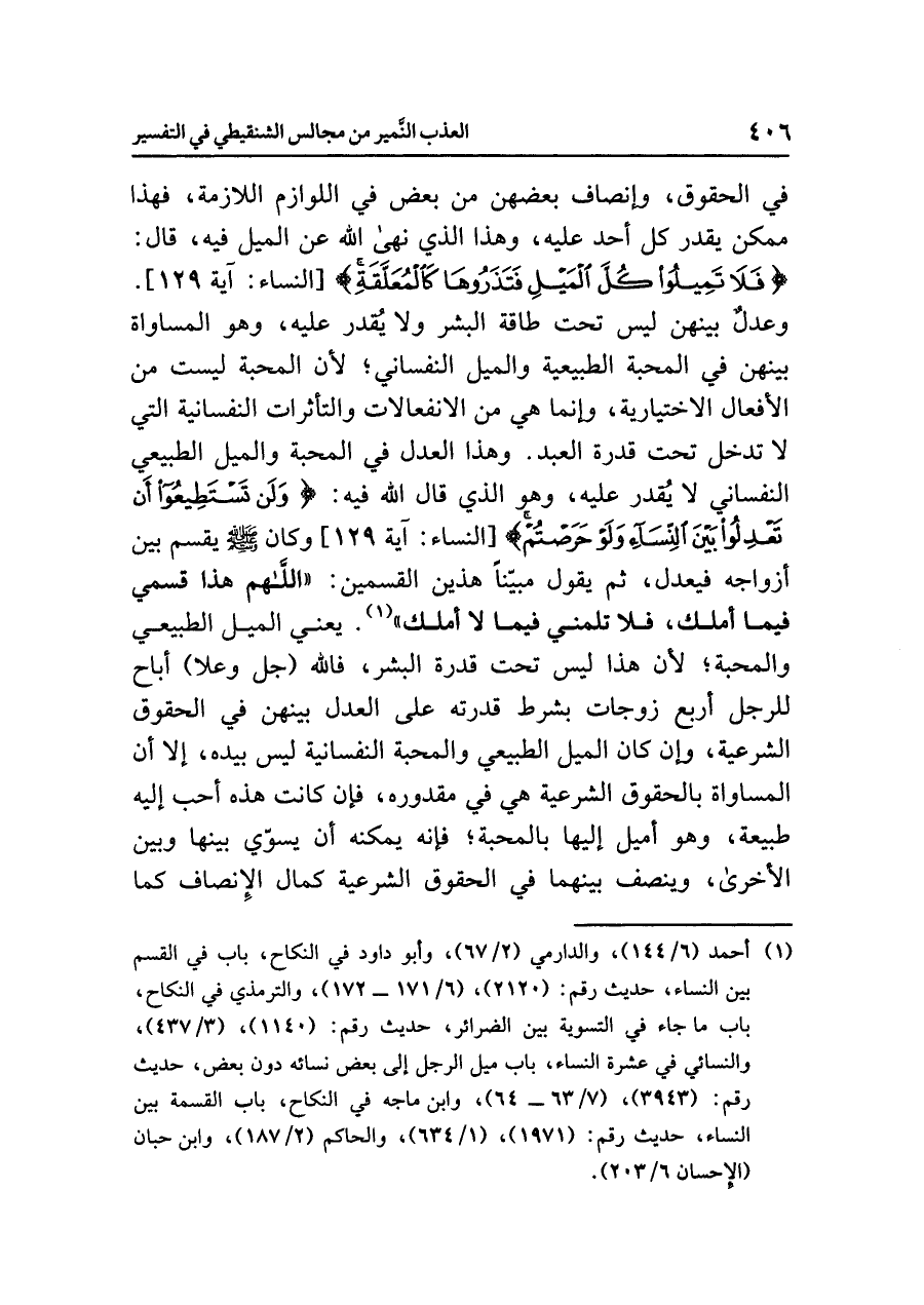 في الحقوق، وإنصاف بعضهن من بعض في اللوازم اللازمة، فهذا ممكن يَقْدِرُ كلّ أحَدٍ عَلَيْهِ، وهذا الذي نهى الله عن الميل فيه، قال: {فَلَا تَمِيلُواْ كُلَّ الْمَيْلِ فَتَذَرُوهَا كَالْمُعَلَّقَةِ} [النساء: آية ١٢٩]. وعدلٌ بينهن ليس تحت طاقة البشر ولا يُقدر عليه، وهو المساواة بينهن في المحبَّةِ الطبيعية والميل النفساني؛ لأن المحبة ليست من الأفعال الاختيارية، وإنما هي من الانفعالات والتأثرات النفسانية التي لا تدخل تحت قدرة العبد. وهذا العدل في المحبة والميل الطبيعي النفساني لا يُقدر عليه، وهو الذي قال الله فيه: {وَلَن تَسْتَطِيعُواْ أَن تَعْدِلُواْ بَيْنَ النِّسَاء وَلَوْ حَرَصْتُمْ} [النساء: آية ١٢٩] وكان صلى الله عليه وسلم يقسم بين أزواجه فيعدل، ثم يقول مبيّنًا هذين القسمين: «اللَّهُمَّ هَذَا قَسْمِي فِيمَا أَمْلِكُ، فَلَا تَلُمْنِي فِيمَا لَا أَمْلِكُ» (¬١).