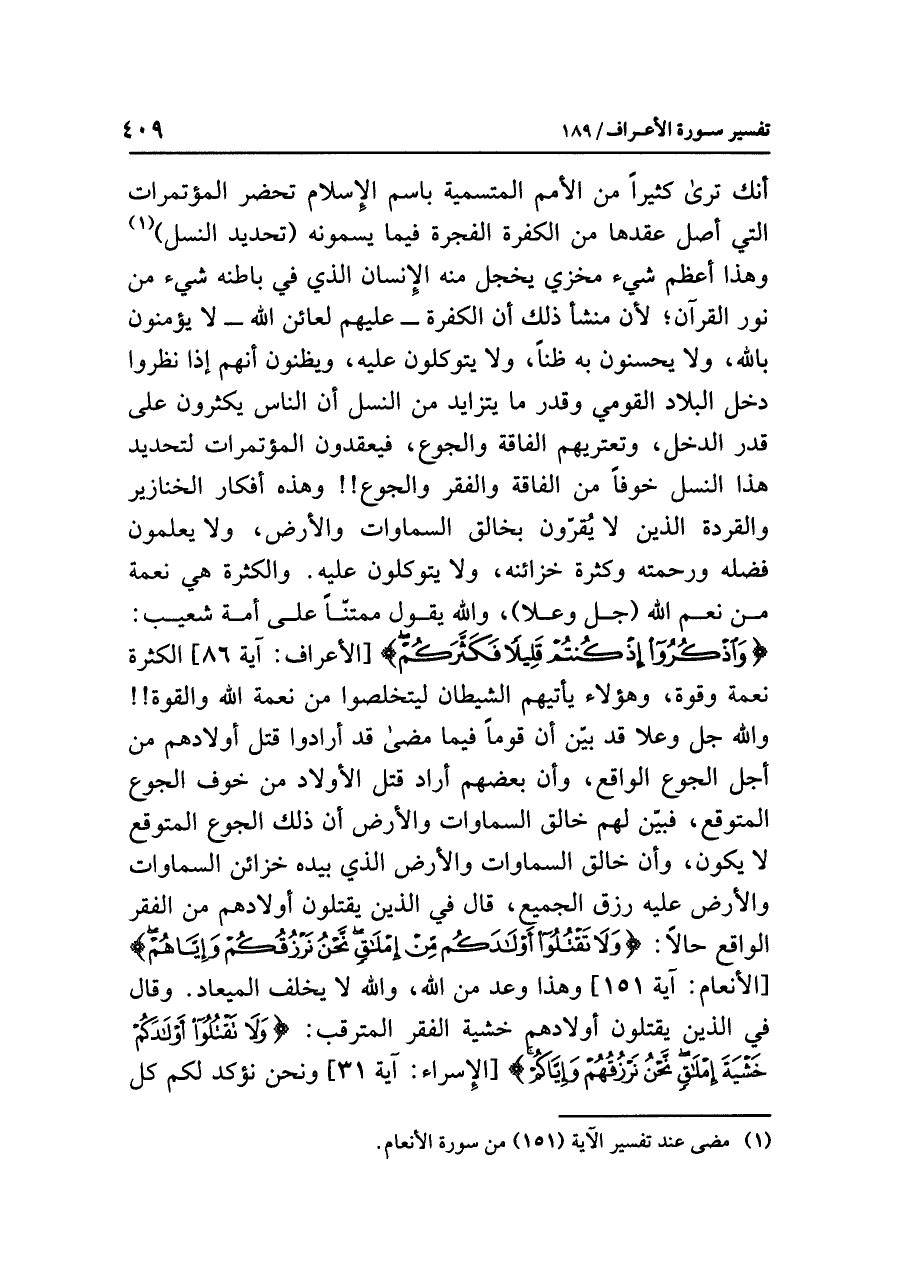 والكثرة هي نعمة من نعم الله (جل وعلا)، والله يقول ممتنًّا على أمة شعيب: {وَاذْكُرُواْ إِذْ كُنتُمْ قَلِيلاً فَكَثَّرَكُمْ} [الأعراف: آية ٨٦] الكثرة نعمة وقوة، وهؤلاء يأتيهم الشيطان ليتخلصوا من نعمة الله والقوة!! والله (جل وعلا) قد بيّن أن قومًا فيما مضى قد أرادوا قتل أولادهم من أجل الجوع الواقع، وأن بعضهم أراد قتل الأولاد من خوف الجوع المتوقع، فبيّن لهم خالق السماوات والأرض أن ذلك الجوع المتوقع لا يكون، وأن خالق السماوات والأرض الذي بيده خزائن السماوات والأرض عليه رزق الجميع، قال في الذين يقتلون أولادهم من الفقر الواقع حالاً: {وَلَا تَقْتُلُواْ أَوْلَادَكُم مِّنْ إمْلَاقٍ نَّحْنُ نَرْزُقُكُمْ وَإِيَّاهُمْ} [الأنعام: آية ١٥١] وهذا وعد من الله، والله لا يخلف الميعاد.