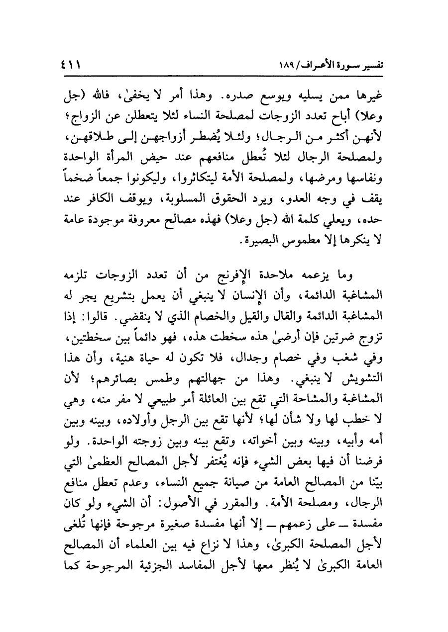 وما يزعمه ملاحدة الإفرنج من أن تعدد الزوجات تلزمه المشاغبة الدائمة، وأن الإنسان لا ينبغي أن يعمل بتشريع يجر له المشاغبة الدائمة والقال والقيل والخصام الذي لا ينقضي. قالوا: إذا تزوج ضرتين فَإِنْ أرْضَى هذه سخطت هذه، فهو دائمًا بين سخطتين، وفي شغب وفي خصام وجدال، فلا تكون له حياة هنية، وأن هذا التشويش لا ينبغي. وهذا من جهالتهم وطمس بصائرهم؛ لأن المشاغبة والمشاحة التي تقع بين العائلة أمر طبيعي لا مفر منه، وهي لا خطب لها ولا شأن لها؛ لأنها تقع بين الرجل وأولاده، وبينه وبين أمه وأبيه، وبينه وبين أخواته، وتقع بينه وبين زوجته الواحدة. ولو فرضنا أن فيها بعض الشيء فإنه يُغتفر لأجل المصالح العظمى التي بيّنا من المصالح العامة من صيانة جميع النساء، وعدم تعطل منافع الرجال، ومصلحة الأمة. والمقرر في الأصول: أن الشيء ولو كان مفسدة -على زعمهم- إلا أنها مفسدة صغيرة مرجوحة فإنها تُلغى لأجل المصلحة الكبرى، وهذا لا نزاع فيه بين العلماء أن المصالح العامة الكبرى لا يُنظر معها لأجل المفاسد الجزئية المرجوحة كما