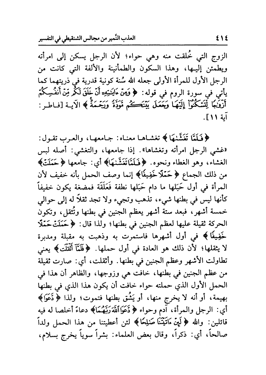 {فَلَمَّا تَغَشَّاهَا} تغشاها معناه: جامعها، والعرب تقول: غشي الرجل امرأته وتغشاها: إذا جامعها، والتغشي: أصله لبس الغشاء، وهو الغطاء ونحوه. {فَلَمَّا تَغَشَّاهَا} أي: جامعها {حَمَلَتْ} من ذلك الجماع {حَمْلاً خَفِيفًا} إنما وصف الحمل بأنه خفيف لأن المرأة في أول حَبَلها ما دام حَبَلها نطفة فَعَلَقَة فمضغة يكون خفيفًا كأنها ليس في بطنها شيء، تذهب وتجيء ولا تجد ثقلاً له إلى حوالي خمسة أشهر، فبعد ستة أشهر يعظم الجنين في بطنها وتُثقل، وتكون الحركة ثقيلة عليها لعظم الجنين في بطنها؛ ولذا قال: {حَمَلَتْ حَمْلاً خَفِيفًا} في أول أشهرها فاستمرت به وذهبت به مقبلة ومدبرة لا يثقلها؛ لأن ذلك هو العادة في أول حملها. {فَلَمَّا أَثْقَلَت} يعني تطاولت الأشهر وعظم الجنين في بطنها، وأثقلت؛ أي: صارت ثقيلة من عظم الجنين في بطنها، خافت هي وزوجها، والظاهر أن هذا في الحمل الأول الذي حملته حواء خافت أن يكون هذا الذي في بطنها بهيمة، أو أنه لا يخرج منها، أو يَشُق بطنها فتموت؛ ولذا {دَّعَوَا} أي: الرجل والمرأة، آدم وحواء {دَّعَوَا اللَّهَ رَبَّهُمَا} دعاءً أخلصا له فيه قائلين: والله {لَئِنْ آتَيْتَنَا صَالِحًا} لئن أعطيتنا من هذا الحمل ولدًا صالحًا، أي: ذكرًا، وقال بعض العلماء: بشرًا سويًّا يخرج بسلام،