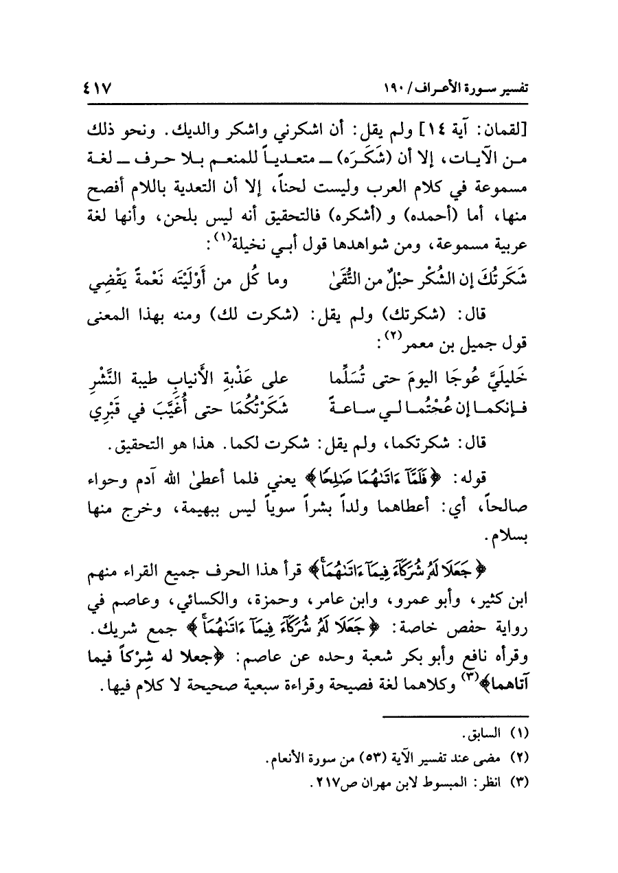 {جَعَلَا لَهُ شُرَكَاء فِيمَا آتَاهُمَا} قرأ هذا الحرف جميع القراء منهم ابن كثير، وأبو عمرو، وابن عامر، وحمزة، والكسائي، وعاصم في رواية حفص خاصة: {جَعَلَا لَهُ شُرَكَاءَ فِيمَا آتَاهُمَا} جمع شريك. وقرأه نافع وأبو بكر شعبة وحده عن عاصم: {جعلا له شِرْكًا فيما آتاهما} (¬٣) وكلاهما لغة فصيحة وقراءة سبعية صحيحة لا كلام فيها.