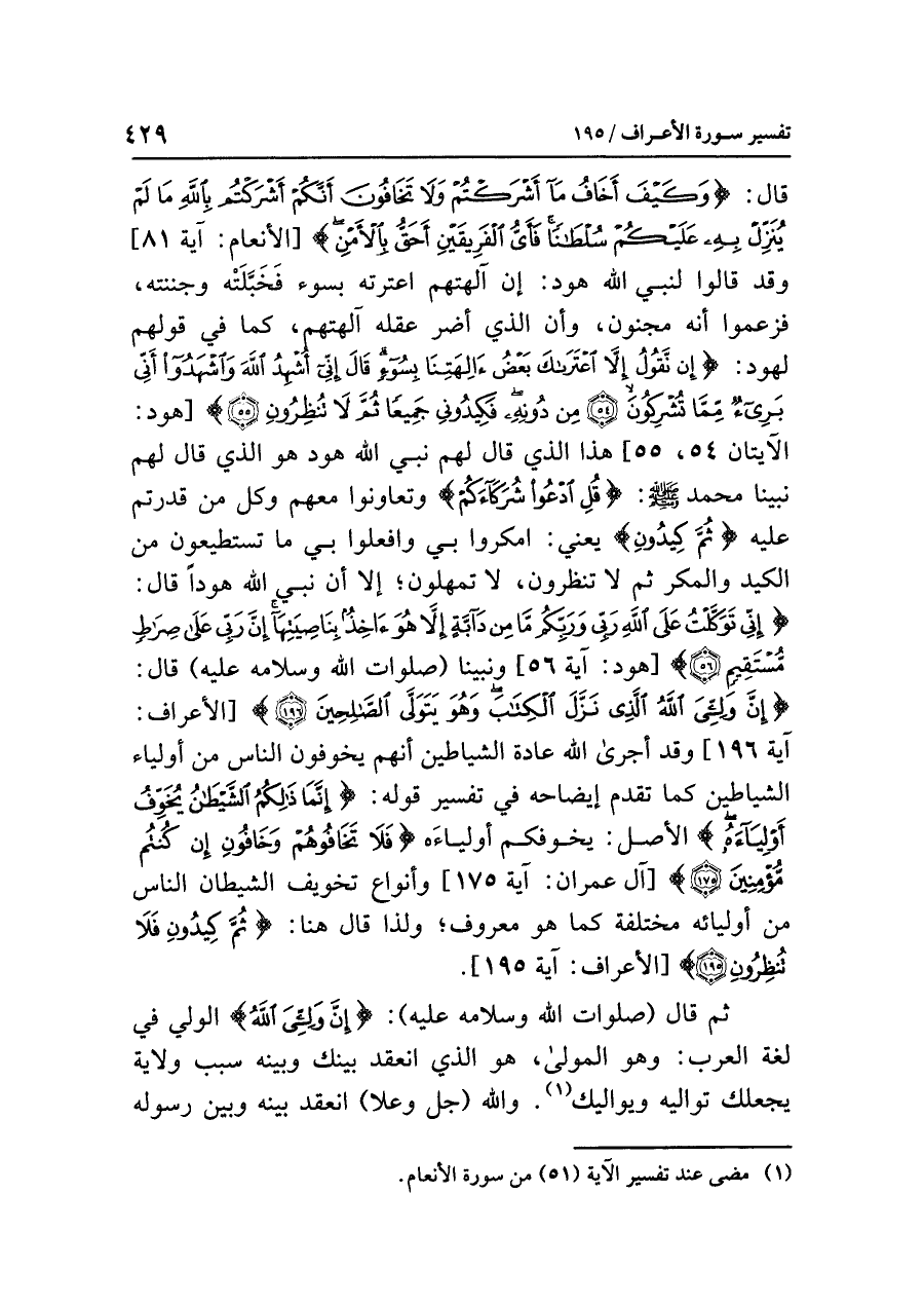 يَتَوَلَّى الصَّالِحِينَ} [الأعراف: آية ١٩٦] وقد أجرى الله عادة الشياطين أنهم يخوفون الناس من أولياء الشياطين كما تقدم إيضاحه في تفسير قوله: {إِنَّمَا ذَلِكُمُ الشَّيْطَانُ يُخَوِّفُ أَوْلِيَاءَهُ} الأصل: يخوفكم أولياءَه {فَلَا تَخَافُوهُمْ وَخَافُونِ إِن كُنتُم مُّؤْمِنِينَ} [آل عمران: آية ١٧٥] وأنواع تخويف الشيطان الناس من أوليائه مختلفة كما هو معروف؛ ولذا قال هنا: {فَكِيدُونِي جَمِيعًا ثُمَّ لَا تُنظِرُونِ} [الأعراف: آية ١٩٥].
