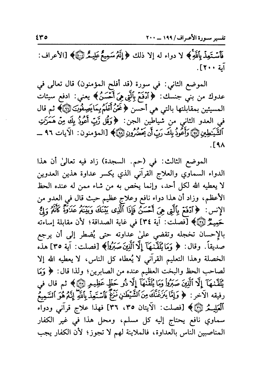 الموضع الثالث: في (حم السجدة) زاد فيه تعالى أن هذا الدواء السماوي والعلاج القرآني الذي يَكْسِر عداوَةَ هَذَيْنِ العَدُوَّيْنِ لا يُعْطِيهِ الله لكلِّ أحد، وإنما يخص به مَنْ شَاءَ مِمَّنْ لَهُ عِنْدَهُ الحَظّ الأعْظَم، وزاد أن هذا دواء نافع وعلاج عظيم حيث قال في العدو من الإنس: {ادْفَعْ بِالَّتِي هِيَ أَحْسَنُ فَإِذَا الَّذِي بَيْنَكَ وَبَيْنَهُ عَدَاوَةٌ كَأَنَّهُ وَلِيٌّ حَمِيمٌ} [فصلت: آية ٣٤] في غاية الصداقة؛ لأن مقابلة إساءته بالإحسان تخجله وتقضي على عداوته حتى يُضطر إلى أن يرجع صديقًا.