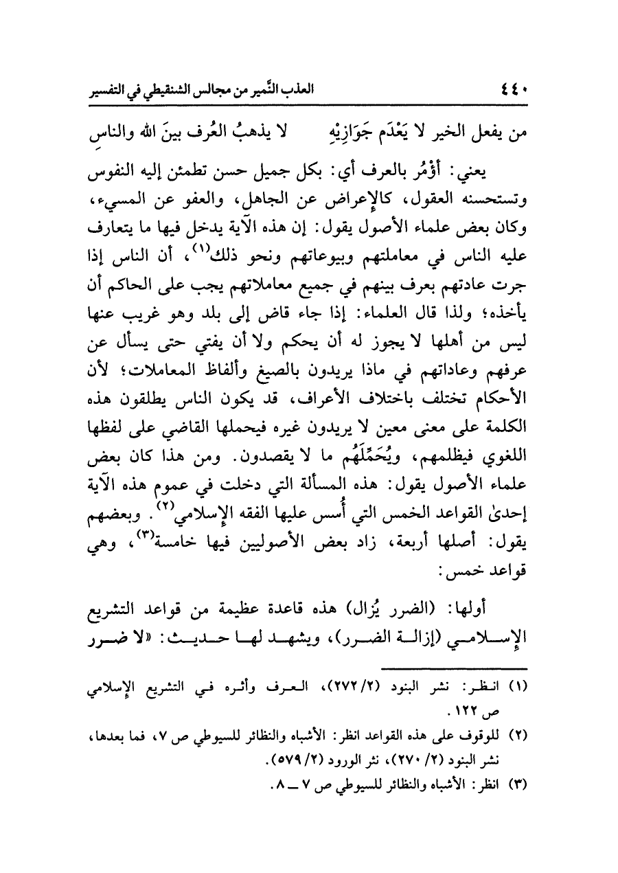 يعني: أُؤْمُر بالعرف؛ أي: بكل جميل حسن تطمئن إليه النفوس وتستحسنه العقول؛ كالإعراض عن الجاهل، والعفو عن المسيء، وكان بعض علماء الأصول يقول: إن هذه الآية يدخل فيها ما يتعارف عليه الناس في معاملتهم وبيوعاتهم ونحو ذلك (¬١)، أن الناس إذا جَرَتْ عَادَتُهُمْ بعرف بينهم في جميع معاملاتهم يجب على الحاكم أن يأخذه؛ ولذا قال العلماء: إذا جاء قَاضٍ إلى بلد وهو غريب عنها ليس من أهلها لا يجوز له أن يحكم ولا أن يفتي حتى يسأل عَنْ عُرْفِهِمْ وعَادَاتهم في ماذا يريدون بالصيغ وألفاظ المعاملات؛ لأن الأحكام تختلف باختلاف الأعراف، قد يكون الناس يطلقون هذه الكلمة على معنًى مُعَيَّن لا يريدون غيره فيحملها القاضي على لفظها اللغوي فيظلمهم، ويُحَمِّلهُم ما لا يقصدون. ومن هذا كان بعض علماء الأصول يقول: هذه المسألة التي دخلت في عموم هذه الآية إحدى القواعد الخمس التي أُسس عليها الفقه الإسلامي (¬٢). وبعضهم يقول: أصلها أربعة، زاد بعض الأصوليين فيها خامسة (¬٣)، وهي قواعد خمس: