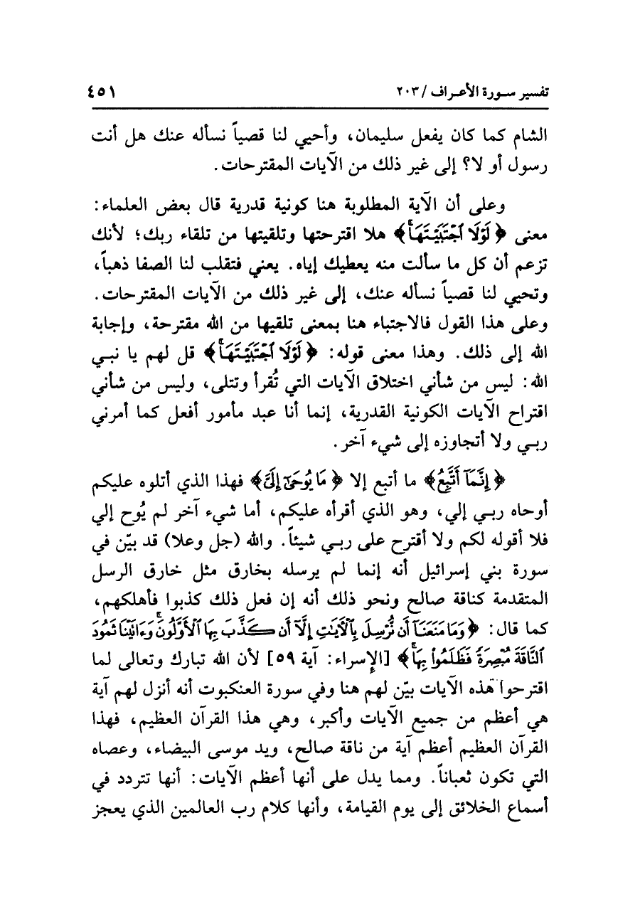وعلى أن الآية المطلوبة هنا كونية قدرية قال بعض العلماء: معنى {لَوْلَا اجْتَبَيْتَهَا} هلا اقترحتها وتَلَقَّيْتَهَا من تلقاء ربك؛ لأنك تزعم أن كل ما سألت منه يعطيك إياه. يعني فتقلب لنا الصفا ذهبًا، وتحيي لنا قصيًا نسأله عنك، إلى غير ذلك من الآيات المقترحات. وعلى هذا القول فالاجتباء هنا بمعنى تلقيها من الله مقترحة، وإجابة الله إلى ذلك. وهذا معنى قوله: {لَوْلَا اجْتَبَيْتَهَا} قل لهم يا نبي الله: ليس من شأني اختلاق الآيات التي تُقرأ وتتلى، وليس من شأني اقتراح الآيات الكونية القدرية، إنما أنا عبد مأمور أفعل كما أمرني ربي ولا أتجاوزه إلى شيء آخر.