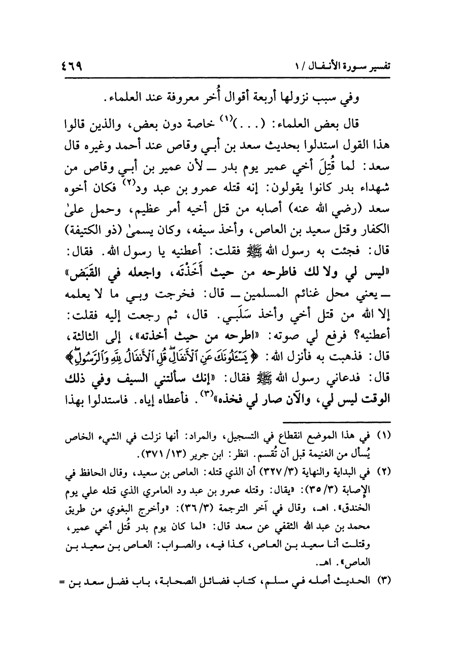 قال بعض العلماء: ( ... ) (¬١) خاصة دون بعض، والذين قالوا هذا القول استدلوا بحديث سعد بن أبي وقاص عند أحمد وغيره قال سعد: لما قُتِلَ أخي عمير يوم بدر -لأن عمير بن أبي وقاص من شهداء بدر كانوا يقولون: إنه قتله عمرو بن عبد ود (¬٢) فكان أخوه سعد (رضي الله عنه) أصابه من قتل أخيه أمر عظيم، وحمل على الكفار وقتل سعيد بن العاص، وأخذ سيفه، وكان يسمى (ذو الكتيفة) قال: فجئت به رسول الله صلى الله عليه وسلم فقلت: أعطنيه يا رسول الله، فقال: «لَيْسَ لِي وَلَا لَكَ فَاطْرَحْهُ مِنْ حَيْثُ أَخَذْتَهُ، وَاجْعَلْهُ فِي القَبَضِ» - يعني محل غنائم المسلمين- قال: فخرجت وبي ما لا يعلمه إلا الله من قتل أخي وأخذ سَلَبي. قال: ثم رجعت إليه فقلت: أعطنيه؟ فرفع لي صوته: «اطْرَحْهُ مِنْ حَيْثُ أَخَذْتَهُ»، إلى الثالثة، قال: فذهبت به فأنزل الله: {يَسْأَلُونَكَ عَنِ الأَنفَالِ قُلِ الأَنفَالُ للهِ وَالرَّسُولِ} قال: فدعاني رسول الله صلى الله عليه وسلم فقال: «إِنَّكَ سَأَلْتَنِي السَّيْفَ وَفِي ذَلِكَ الْوَقْتِ لَيْسَ لِي، وَالآنَ صَارَ لِي فَخُذْهُ» (¬٣). فأعطاه إياه.