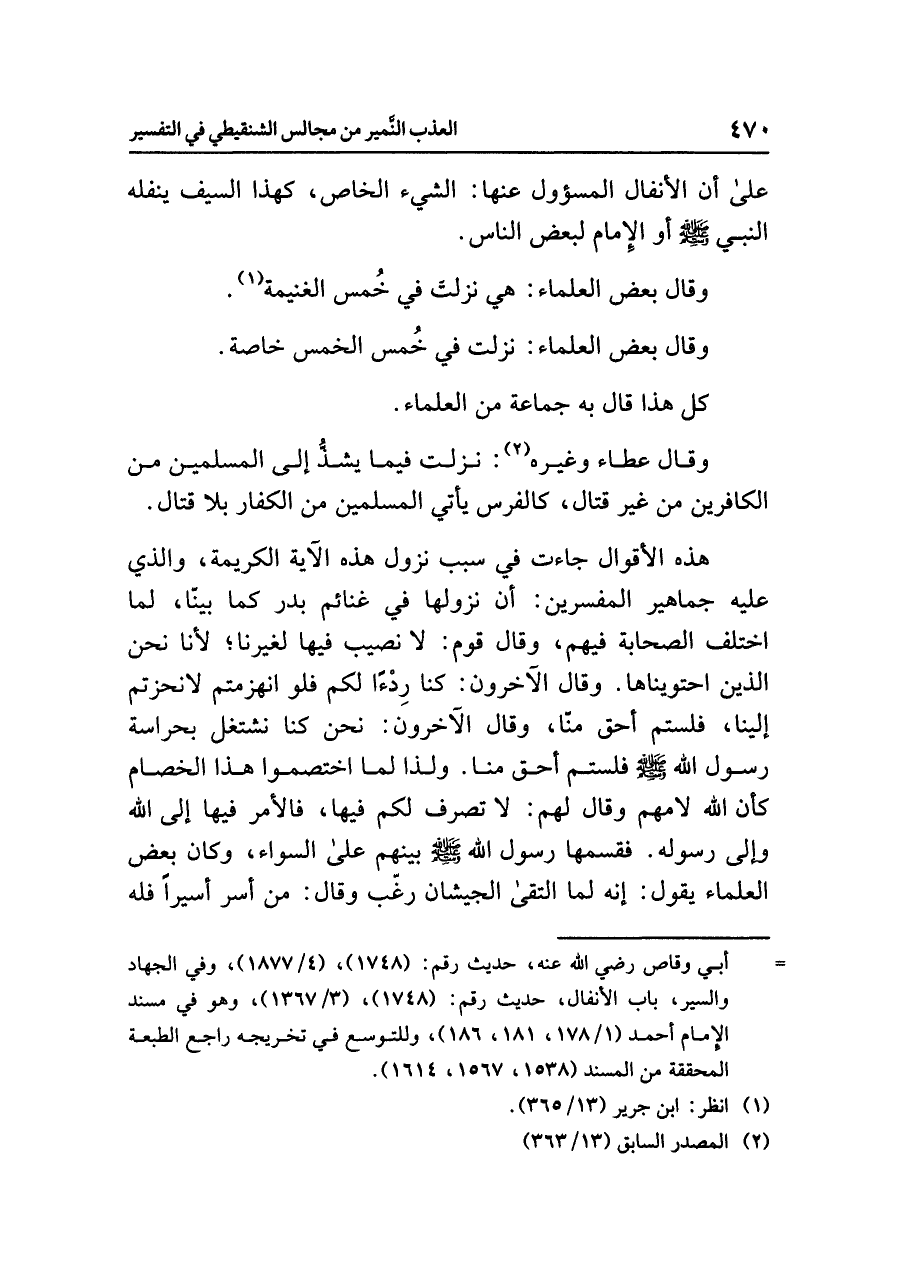 هذه الأقوال جاءت في سبب نزول هذه الآية الكريمة، والذي عليه جماهير المفسرين: أن نزولها في غنائم بدر كما بينّا، لما اختلف الصحابة فيهم، وقال قوم: لا نصيب فيها لغيرنا؛ لأنا نحن الذين احتويناها. وقال الآخرون: كنا رِدْءًا لكم فلو انهزمتم لانحزتم إلينا، فلستم أحق منّا، وقال الآخرون: نحن كنا نشتغل بحراسة رسول الله صلى الله عليه وسلم فلستم أحق منا. ولذا لما اختصموا هذا الخصام كأن الله لامهم وقال لهم: لا تصرف لكم فيها، فالأمر فيها إلى الله وإلى رسوله. فقسمها رسول الله صلى الله عليه وسلم بينهم على السواء، وكان بعض العلماء يقول: إنه لما التقى الجيشان رغّب وقال: مَنْ أَسرَ أسيرًا فله