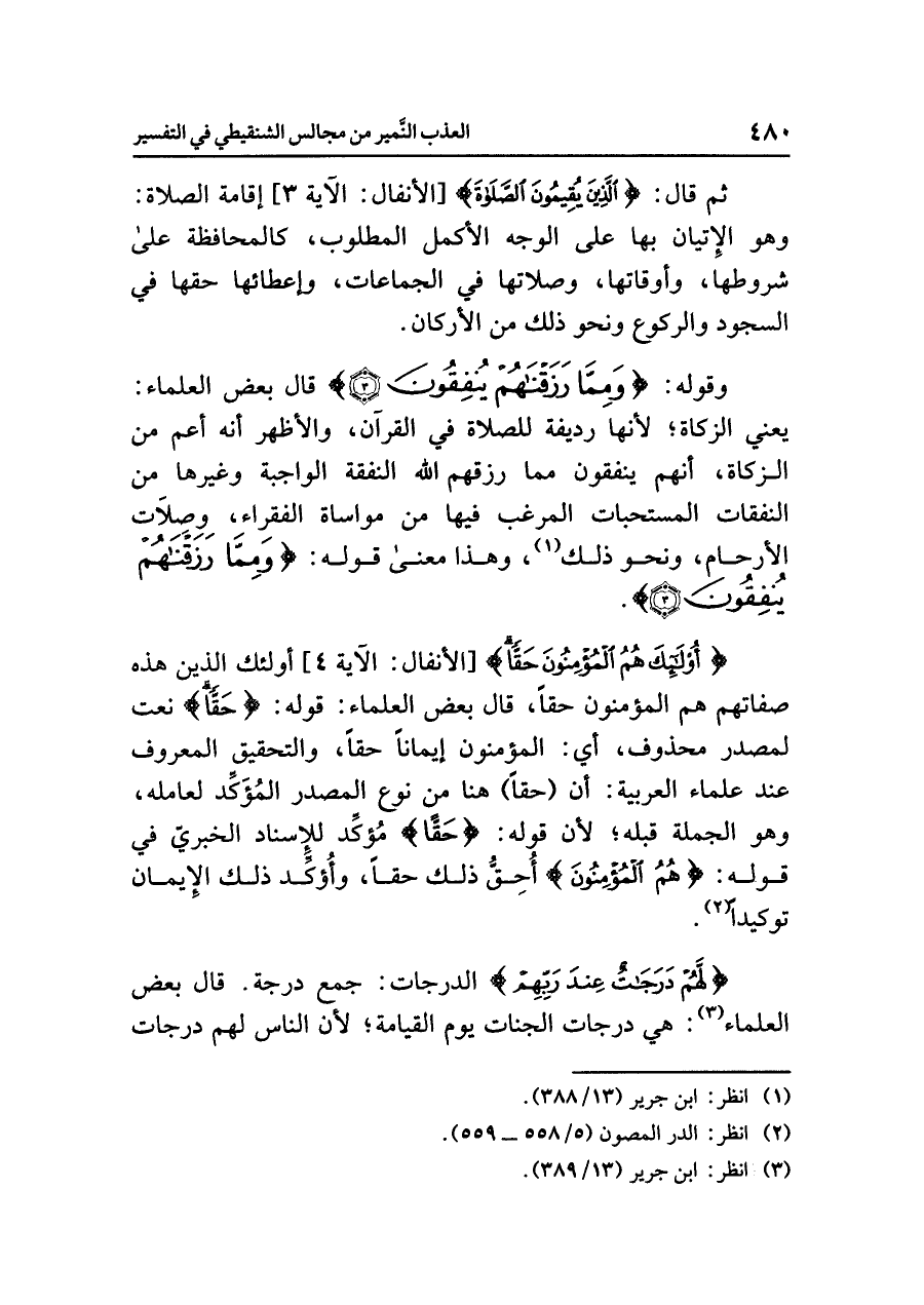 ثم قال: {الَّذِينَ يُقِيمُونَ الصَّلاةَ} [الأنفال: الآية ٣] إقامة الصلاة: وهو الإتيان بها على الوجه الأكمل المطلوب، كالمحافظة على شروطها، وأوقاتها، وصلاتها في الجماعات، وإعطائها حقها في السجود والركوع ونحو ذلك من الأركان.