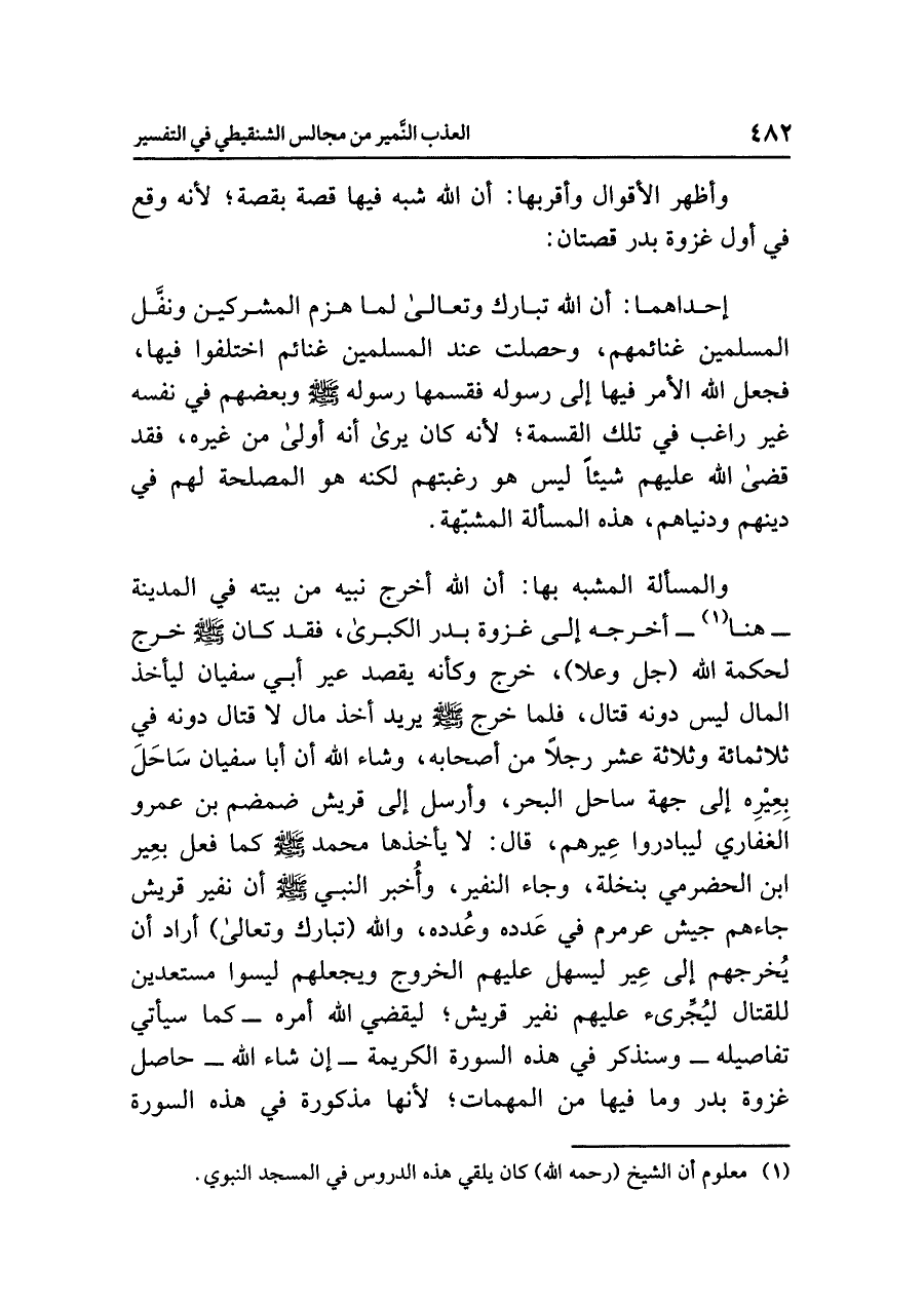 والمسألة المشبه بها: أن الله أخرج نبيه من بيته في المدينة -هنا (¬١) - أخرجه إلى غزوة بدر الكبرى، فقد كان صلى الله عليه وسلم خرج لحكمة الله (جل وعلا)، خرج وكأنه يقصد عير أبي سفيان ليأخذ المال ليس دونه قتال، فلما خرج صلى الله عليه وسلم يريد أخذ مال لا قتال دونه في ثلاثمائة وثلاثة عشر رجلاً من أصحابه، وشاء الله أن أبا سفيان سَاحَلَ بِعِيْرِه إلى جهة ساحل البحر، وأرسل إلى قريش ضمضم بن عمرو الغفَاري ليبادروا عِيرهم، قال: لا يأخذها محمد صلى الله عليه وسلم كما فعل بعِير ابن الحضرمي بنخلة، وجاء النفير، وأُخبر النبي صلى الله عليه وسلم أن نفير قريش جاءهم جيش عرمرم في عَدده وعُدده، والله (تبارك وتعالى) أراد أن يُخرجهم إلى عِير ليسهل عليهم الخروج ويجعلهم ليسوا مستعدين للقتال ليُجَرِّئ عليهم نفير قريش.