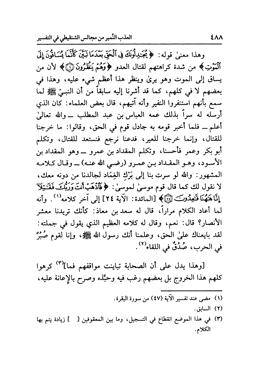 وهذا معنى قوله: {يُجَادِلُونَكَ فِي الْحَقِّ بَعْدَ مَا تَبَيَّنَ كَأَنَّمَا يُسَاقُونَ إِلَى الْمَوْتِ} من شدة كراهتهم لقتال العدو {وَهُمْ يَنظُرُونَ} لأن من يساق إلى الموت وهو يرى وينظر هذا أعظم شيء عليه، وهذا في بعضهم لا في كلهم، كما قد أشرنا إليه سابقًا من أن النبيّ صلى الله عليه وسلم لما سمع بأنهم استنفروا النفير وأنه آتيهم، قال بعض العلماء: كان الذي أرسله له سرًّا بذلك عمه العباس بن عبد المطلب -والله تعالى أعلم- فلما أخبر قومه به جادل قوم في الحق، وقالوا: ما خرجنا للقتال، وإنما خرجنا للعير، فدعنا نرجع فنستعد للقتال، وتكلم أبو بكر وعمر فأحسنا، وتكلم المقداد بن عمرو -وهو المقداد بن الأسود، وهو المقداد بن عمرو (رضي الله عنه) - وقال كلامه المشهور: والله لو سرت بنا إلى بَرْكِ الغِمَاد لجالدنا من دونه معك، لا نقول لك كما قال قوم موسى لموسى: {فَاذْهَبْ أَنتَ وَرَبُّكَ فَقَاتِلا إِنَّا هَاهُنَا قَاعِدُونَ} [المائدة: الآية ٢٤] إلى آخر كلامه (¬١). وأنه لما أعاد الكلام مرارًا، قال له سعد بن معاذ: كأنك تريدنا معشر الأنصار؟ قال: نعم، وقال له كلامه العظيم الذي يقول في جملته: لقد بايعناك على الحق، وعلمنا أنك رسول الله صلى الله عليه وسلم، وإنا لقوم صُبُرٌ في الحرب، صُدقٌ في اللقاء (¬٢).