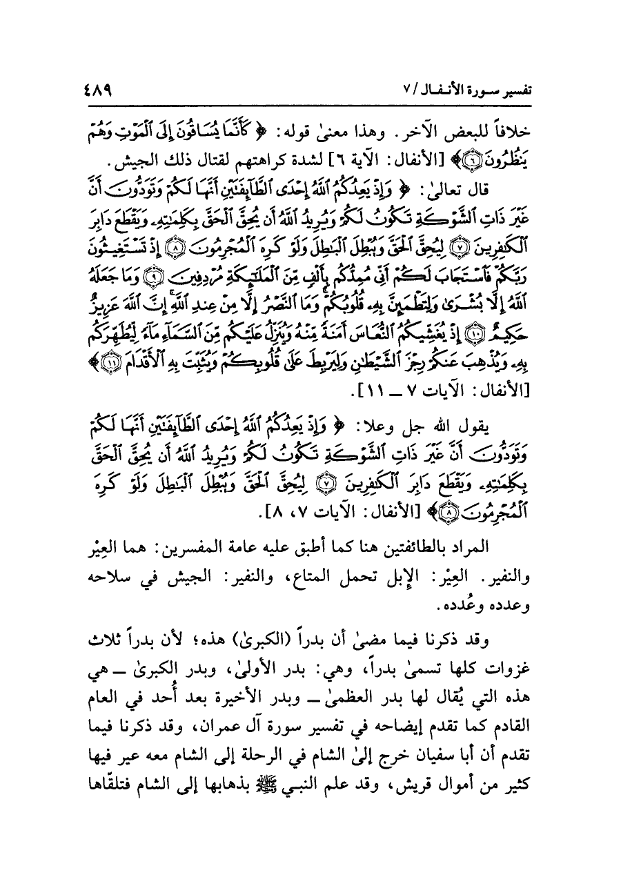 قال تعالى: {وَإِذْ يَعِدُكُمُ اللَّهُ إِحْدَى الطَّائِفَتِيْنِ أَنَّهَا لَكُمْ وَتَوَدُّونَ أَنَّ غَيْرَ ذَاتِ الشَّوْكَةِ تَكُونُ لَكُمْ وَيُرِيدُ اللَّهُ أَن يُحِقَّ الحَقَّ بِكَلِمَاتِهِ وَيَقْطَعَ دَابِرَ الْكَافِرِينَ (٧) لِيُحِقَّ الْحَقَّ وَيُبْطِلَ الْبَاطِلَ وَلَوْ كَرِهَ الْمُجْرِمُونَ (٨) إِذْ تَسْتَغِيثُونَ رَبَّكُمْ فَاسْتَجَابَ لَكُمْ أَنِّي مُمِدُّكُم بِأَلْفٍ مِّنَ الْمَلآئِكَةِ مُرْدِفِينَ (٩) وَمَا جَعَلَهُ اللَّهُ إِلَاّ بُشْرَى وَلِتَطْمَئِنَّ بِهِ قُلُوبُكُمْ وَمَا النَّصْرُ إِلَاّ مِنْ عِندِ اللَّهِ إِنَّ اللَّهَ عَزِيزٌ حَكِيمٌ (١٠) إِذْ يُغَشيكُمُ النُّعَاسَ أَمَنَةً مِّنْهُ وَيُنَزِّلُ عَلَيْكُم مِّن السَّمَاء مَاء لِّيُطَهِّرَكُم بِهِ وَيُذْهِبَ عَنكُمْ رِجْزَ الشَّيْطَانِ وَلِيَرْبِطَ عَلَى قُلُوبِكُمْ وَيُثَبِّتَ بِهِ الأَقْدَامَ (١١)} [الأنفال: الآيات ٧ - ١١].