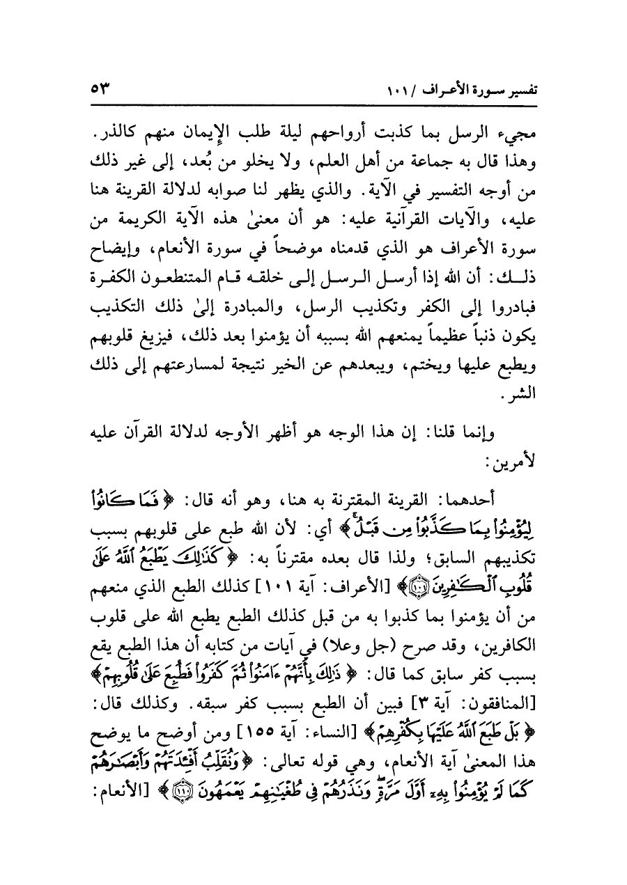 مجيء الرسل بما كذبت أرواحهم ليلة طلب الإيمان منهم كالذر، وهذا قال به جماعة من أهل العلم، ولا يخلو من بُعد، إلى غير ذلك من أوجه التفسير في الآية. والذي يظهر لنا صوابه لدلالة القرينة هنا عليه، والآيات القرآنية عليه: هو أن معنى هذه الآية الكريمة من سورة الأعراف هو الذي قدمناه موضحًا في سورة الأنعام، وإيضاح ذلك: أن الله إذا أرسل الرسل إلى خلقه قام المُتَنَطِّعون الكفرة فبادروا إلى الكفر وتكذيب الرسل، والمبادرة إلى ذلك التكذيب يكون ذنبًا عظيمًا يمنعهم الله بسببه أن يؤمنوا بعد ذلك، فيزيغ قلوبهم ويطبع عليها ويختم، ويبعدهم عن الخير نتيجة لمسارعتهم إلى ذلك الشر.