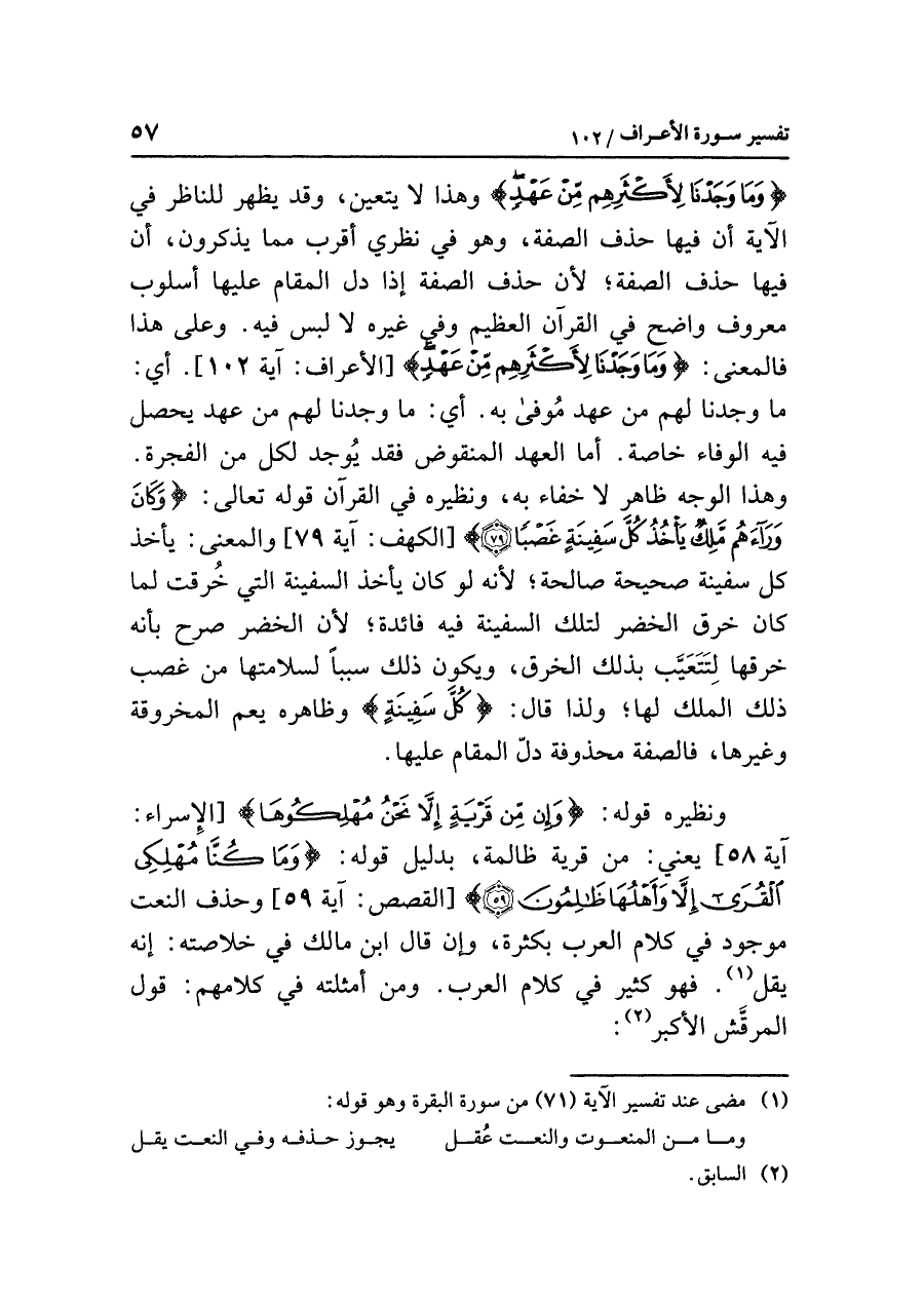 {وَمَا وَجَدْنَا لأَكْثَرِهِم مِّنْ عَهْدٍ} وهذا لا يتعين، وقد يظهر للناظر في الآية أن فيها حذف الصفة، وهو في نظري أقرب مما يذكرون، أن فيها حذف الصفة؛ لأن حذف الصفة إذا دل المقام عليها أسلوب معروف واضح في القرآن العظيم وفي غيره لا لبس فيه. وعلى هذا فالمعنى: {وَمَا وَجَدْنَا لأَكْثَرِهِم مِّنْ عَهْدٍ} [الأعراف: آية ١٠٢]. أي: ما وجدنا لهم من عهد مُوفى به. أي: ما وجدنا لهم من عهد يحصل فيه الوفاء خاصة، أما العهد المنقوض فقد يُوجد لكل من الفجرة. وهذا الوجه ظاهر لا خفاء به، ونظيره في القرآن قوله تعالى: {وَكَانَ وَرَاءهُم مَّلِكٌ يَأْخُذُ كُلَّ سَفِينَةٍ غَصْبًا} [الكهف: آية ٧٩] والمعنى: يأخذ كل سفينة صحيحة صالحة؛ لأنه لو كان يأخذ السفينة التي خُرقت لما كان خرق الخضر لتلك السفينة فيه فائدة؛ لأن الخضر صرح بأنه خرقها لِتَتَعَيَّب بذلك الخرق، ويكون ذلك سببًا لسلامتها من غصب ذلك الملك لها؛ ولذا قال: {كُلَّ سَفِينَةٍ} وظاهره يعم المخروقة وغيرها، فالصفة محذوفة دلّ المقام عليها.