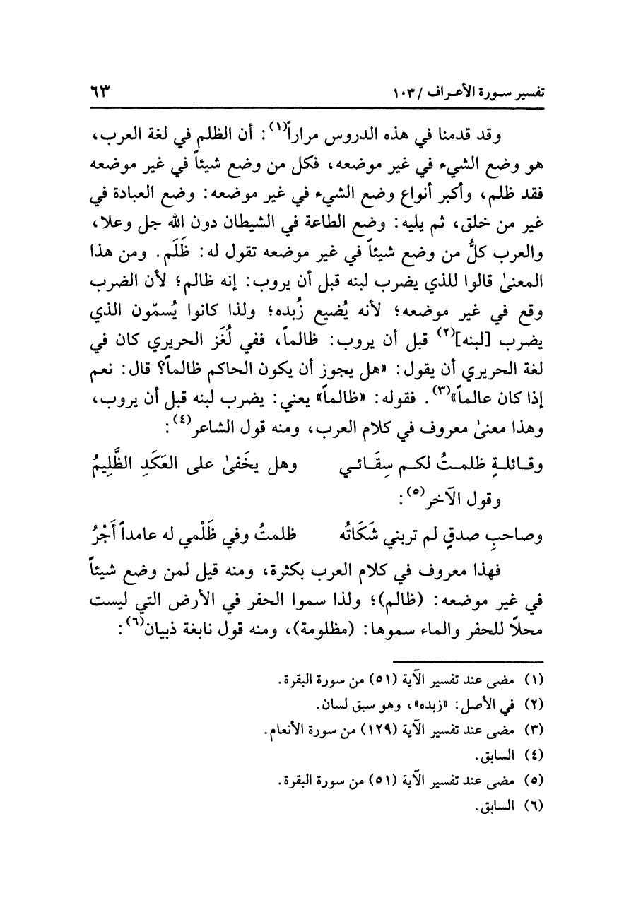 وقد قدمنا في هذه الدروس مرارًا (¬١): أن الظلم في لغة العرب هو: وضع الشيء في غير موضعه فكل من وضع شيئًا في غير موضعه فقد ظلم، وأكبر أنواع وضع الشيء في غير موضعه: وضع العبادة في غير من خلق، ثم يليه: وضع الطاعة في الشيطان دون الله (جل وعلا)، والعرب كلُّ من وضع شيئًا في غير موضعه تقول له: ظَلَم. ومن هذا المعنى قالوا للذي يضرب لبنه قبل أن يروب: إنه ظالم؛ لأن الضرب وقع في غير موضعه؛ لأنه يُضيع زُبده؛ ولذا كانوا يُسمّون الذي يضرب [لبنه] (¬٢) قبل أن يروب: ظالمًا، ففي لُغَز الحريري يقول: «هل يجوز أن يكون الحاكم ظالمًا؟ قال: نعم إذا كان عالمًا» (¬٣). فقوله: «ظالمًا» يعني: يضرب لبنه قبل أن يروب، وهذا معنى معروف في كلام العرب، ومنه قول الشاعر (¬٤):
