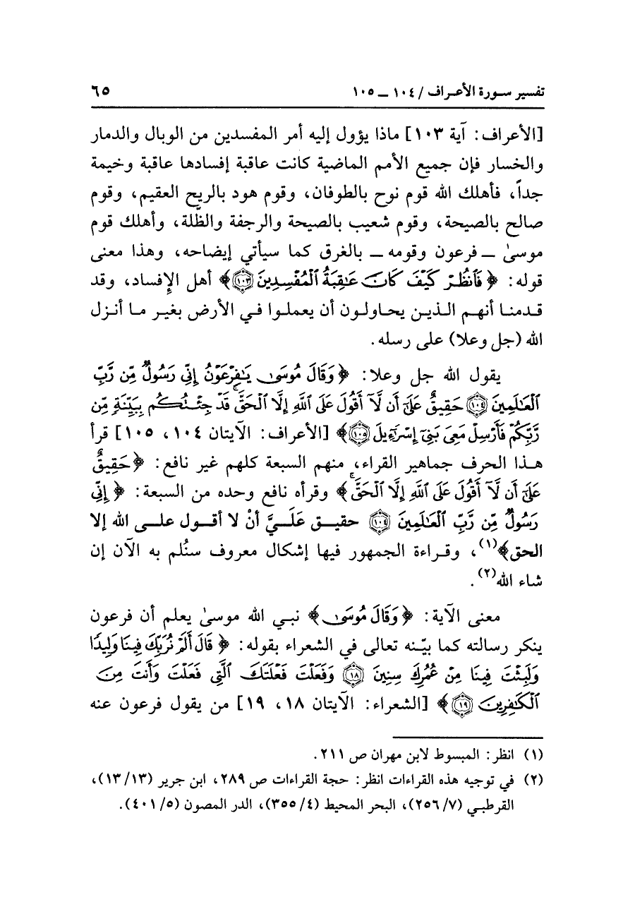 يقول الله جل وعلا: {وَقَالَ مُوسَى يَا فِرْعَوْنُ إِنِّي رَسُولٌ مِّن رَّبِّ الْعَالَمِينَ (١٠٤) حَقِيقٌ عَلَى أَن لَاّ أَقُولَ عَلَى اللَّهِ إِلَاّ الْحَقَّ قَدْ جِئْتُكُم بِبَيِّنَةٍ مِّن رَّبِّكُمْ فَأَرْسِلْ مَعِيَ بَنِي إِسْرَائِيلَ (١٠٥)} [الأعراف: الآيتان ١٠٤، ١٠٥] قرأ هذا الحرف جماهير القراء، منهم السبعة كلهم غير نافع: {حَقِيقٌ عَلَى أَن لَاّ أَقُولَ عَلَى اللَّهِ إِلَاّ الْحَقَّ} وقرأه نافع وحده من السبعة: {إِنِّي رَسُولٌ مِّن رَّبِّ الْعَالَمِينَ حقيق عَلَيَّ أنْ لا أقول على الله إلا الحق} (¬١)، وقراءة الجمهور فيها إشكال معروف سنُلم به الآن إن شاء الله (¬٢).