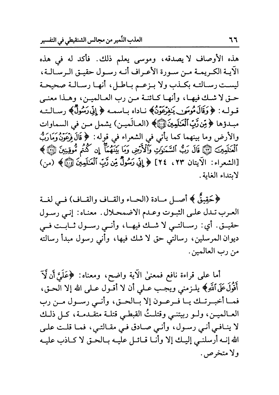 هذه الأوصاف لا يصدقه، وموسى يعلم ذلك. فأكد له في هذه الآية الكريمة من سورة الأعراف أنه رسول حقيق الرسالة، ليست رسالته بكذب ولا بزعم باطل، أنها رسالة صحيحة حق لا شك فيها، وأنها كائنة من رب العالمين، وهذا معنى قوله: {وَقَالَ مُوسَى يَا فِرْعَوْنُ} ناداه باسمه {إِنِّي رَسُولٌ} رسالته مبدؤها {مِّن رَّبِّ الْعَالَمِينَ} (العالَمين) تشمل من في السماوات والأرض وما بينهما كما يأتي في الشعراء في قوله: {قَالَ فِرْعَوْنُ وَمَا رَبُّ الْعَالَمِينَ (٢٣) قَالَ رَبُّ السَّمَاوَاتِ وَالْأَرْضِ وَمَا بَيْنَهُمَا إن كُنتُم مُّوقِنِينَ (٢٤)} [الشعراء: الآيتان ٢٣، ٢٤] {إِنِّي رَسُولٌ مِّن رَّبِّ الْعَالَمِينَ} (من) لابتداء الغاية.