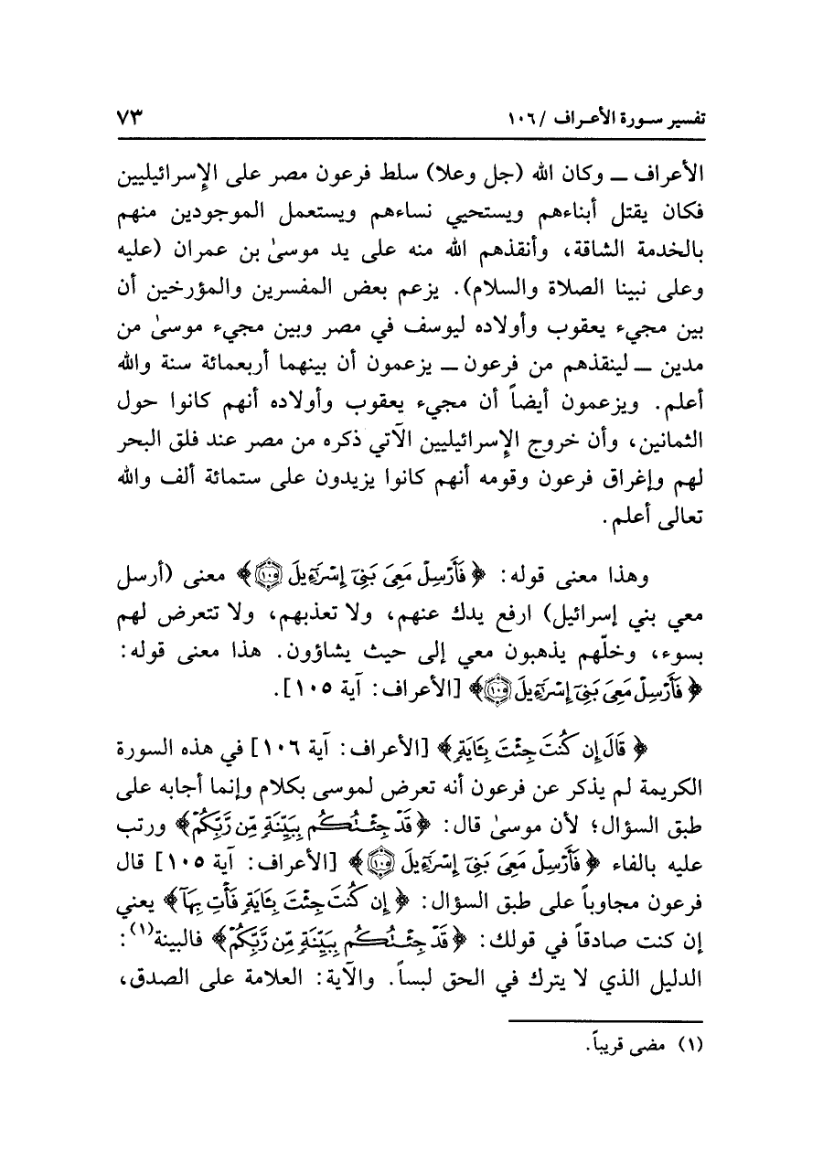 وهذا معنى قوله: {فَأَرْسِلْ مَعِيَ بَنِي إِسْرَائِيلَ} معنى (أرسل معي بني إسرائيل) ارفع يدك عنهم، ولا تعذبهم، ولا تتعرض لهم بسوء، وخلّهم يذهبون معي إلى حيث يشاءون، هذا معنى قوله: {فَأَرْسِلْ مَعِيَ بَنِي إِسْرَائِيلَ} [الأعراف: آية ١٠٥].