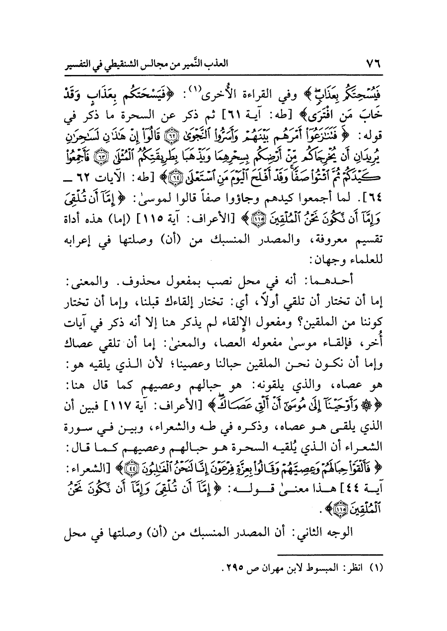 فَيُسْحِتَكُمْ بِعَذَابٍ} وفي القراءة الأخرى (¬١): {فَيَسْحَتَكُم بِعَذَابٍ وَقَدْ خَابَ مَن افْتَرَى} [طه: آية ٦١] ثم ذكر عن السحرة ما ذكر في قولة: {فَتَنَازَعُوا أَمْرَهُم بَيْنَهُمْ وَأَسَرُّوا النَّجْوَى (٦٢) قَالُوا إِنْ هَذَانِ لَسَاحِرَانِ يُرِيدَانِ أَن يُخْرِجَاكُم مِّنْ أَرْضِكُم بِسِحْرِهِمَا وَيَذْهَبَا بِطَرِيقَتِكُمُ الْمُثْلَى (٦٣) فَأَجْمِعُوا كَيْدَكُمْ ثُمَّ ائْتُوا صَفًّا وَقَدْ أَفْلَحَ الْيَوْمَ مَنِ اسْتَعْلَى (٦٤)} [طه: الآيات ٦٢ - ٦٤]. لما أجمعوا كيدهم وجاءوا صفًّا قالوا لموسى: {إِمَّا أَن تُلْقِيَ وَإِمَّا أَن نَّكُونَ نَحْنُ الْمُلْقِينَ} [الأعراف: آية ١١٥] (إما) هذه أداة تقسيم معروفة، والمصدر المنسبك من (أن) وصلتها في إعرابه للعلماء وجهان:
