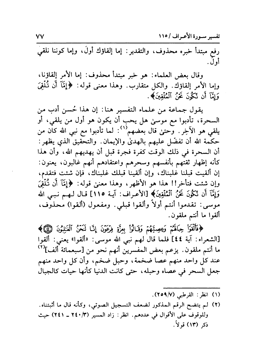 يقول جماعة من علماء التفسير هنا: إن هذا حُسن أدب من السحرة، تأدبوا مع موسى هل يحب أن يكون هو أول من يلقي، أو يلقي هو الآخر. وحتى قال بعضهم (¬١): لما تأدبوا مع نبي الله كان من حكمة الله أن تفضّل عليهم بالهدى والإيمان. والتحقيق الذي يظهر: أن السحرة في ذلك الوقت كفرة فجرة قبل أن يهديهم الله، وأن هذا كأنه إظهار ثقتهم بأنفسهم وسحرهم واعتقادهم أنهم غالبون، يعنون: إن ألقيت قبلنا غلبناك، وإن ألقينا قبلك غلبناك، فإن شئت فتقدم، وإن شئت فتأخر!! هذا هو الأظهر، وهذا معنى قوله: {إِمَّا أَن تُلْقِيَ وَإِمَّا أَن نَّكُونَ نَحْنُ الْمُلْقِينَ} [الأعراف: آية ١١٥] قال لهم نبي الله موسى: تقدموا أنتم أولاً وألقوا قبلي. ومفعول (ألقوا) محذوف، ألقوا ما أنتم ملقون.