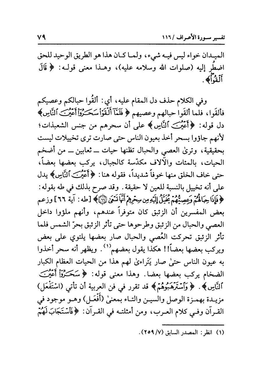 وفي الكلام حذف دل المقام عليه، أي: ألقُوا حبالكم وعصيكم فألقَوا، فلما ألقَوا حبالهم وعصيهم {فَلَمَّا أَلْقَوْا سَحَرُواْ أَعْيُنَ النَّاسِ} دل قوله: {أَعْيُنَ النَّاسِ} على أن سحرهم من جنس الشعبذات؛ لأنهم جاءوا بسحر أخذ بعيون الناس حتى صارت ترى تخييلات ليست بحقيقية، وترى العصي والحبال تظنها حيات - ثعابين - من أضخم الحيات، بالمئات والآلاف مكدّسة كالجبال، يركب بعضها بعضًا، حتى خاف الخلق منها خوفًا شديدًا، فقوله هنا: {أَعْيُنَ النَّاسِ} يدل على أنه تخييل بالنسبة للعين لا حقيقة. وقد صرح بذلك في طه بقوله: {فَإِذَا حِبَالُهُمْ وَعِصِيُّهُمْ يُخَيَّلُ إِلَيْهِ مِن سِحْرِهِمْ أَنَّهَا تَسْعَى} [طه: آية ٦٦] وزعم بعض المفسرين أن الزئبق كان متوفرًا عندهم، وأنهم ملؤوا داخل العصي والحبال من الزئبق وطرحوها حتى تأثر الزئبق بحرّ الشمس فلما تأثر الزئبق تحركت العُصي والحبال صار بعضها يلتوي على بعض ويركب بعضها بعضًا!! هكذا يقول بعضهم (¬١). ويظهر أنه سحر أخذوا به عيون الناس حتى صار يَتَراءى لهم هذا من الحيات العظام الكبار الضخام يركب بعضها بعضًا. وهذا معنى قوله: {سَحَرُواْ أَعْيُنَ النَّاسِ}. {وَاسْتَرْهَبُوهُمْ} قد تقرر في فن العربية أن تأتي (اسْتَفْعَل) مزيدة بهمزة الوصل والسين والتاء بمعنى (أفْعَل) وهو موجود في القرآن وفي كلام العرب، ومن أمثلته في القرآن: {فَاسْتَجَابَ لَهُمْ